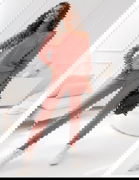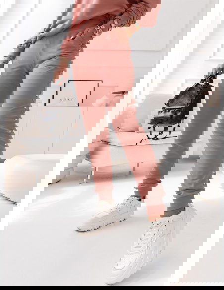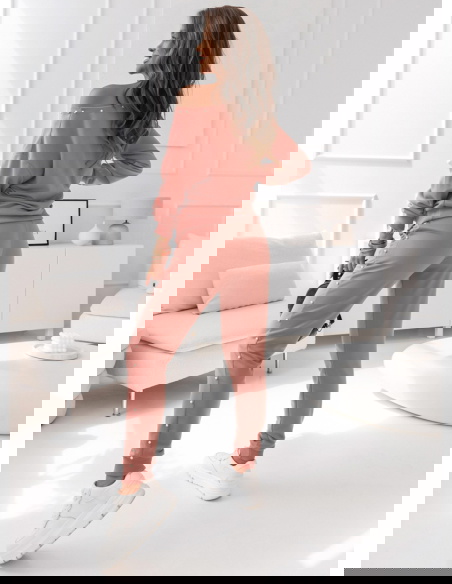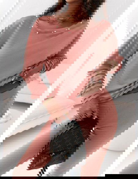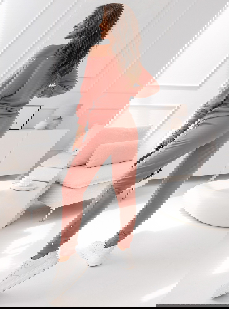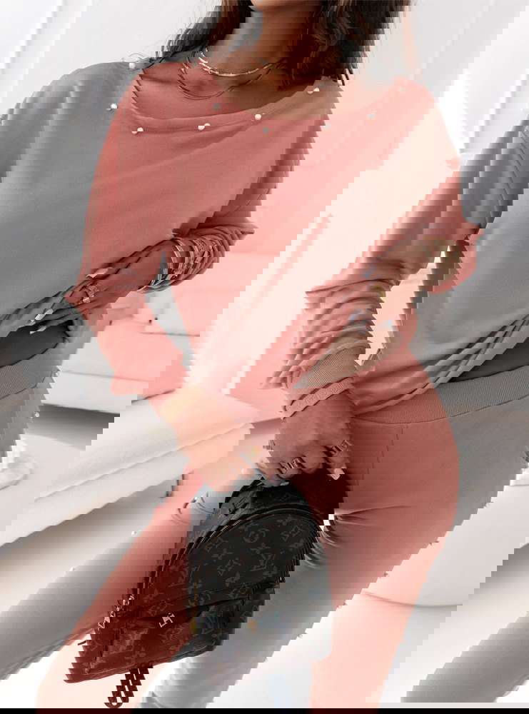 Komplet dresowy z ozdobnymi perełkami Wellko - brudny róż Komplet w odcieniu brudnego różu z perełkami dodaje całości wyjątkowego uroku, nadając Twojej stylizacji kobiecego i eleganckiego akcentu.
