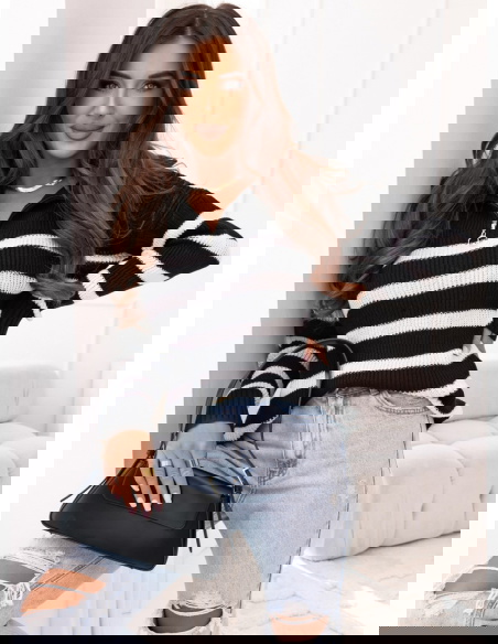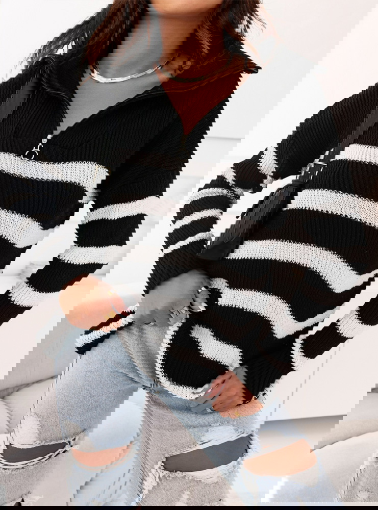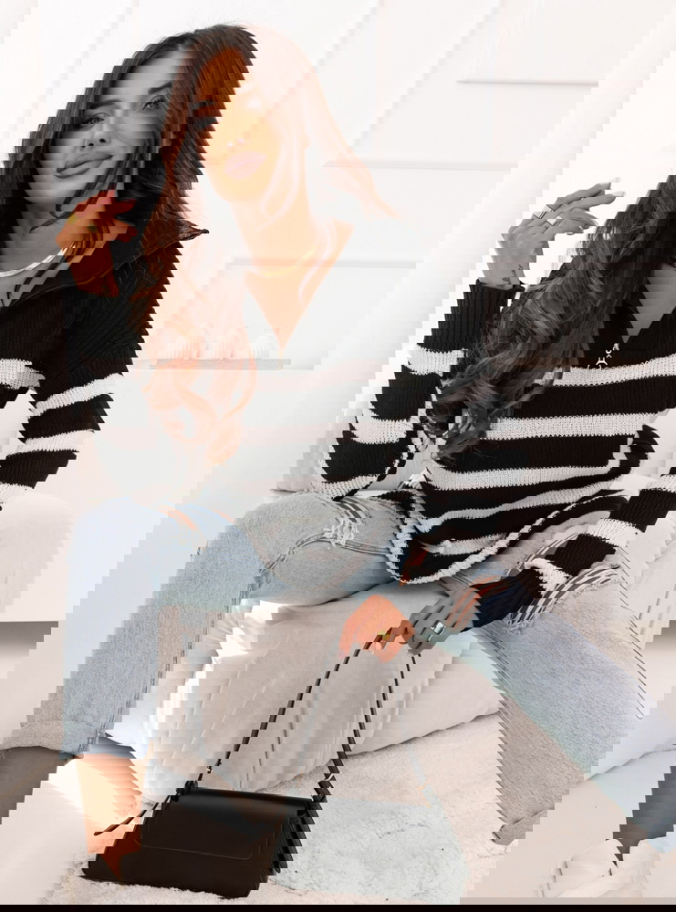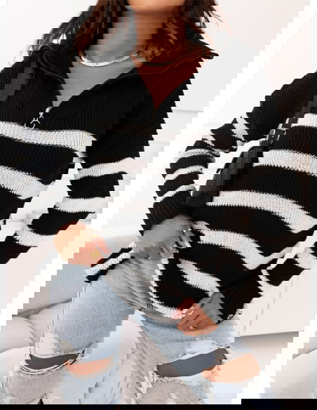 Czarny sweter w paski z kołnierzem Fionna - wzór 3 Czarny sweter w paski z kołnierzem to element, który dodaje klasy i stylu każdej stylizacji, tworząc efektowny i zadbany wygląd.