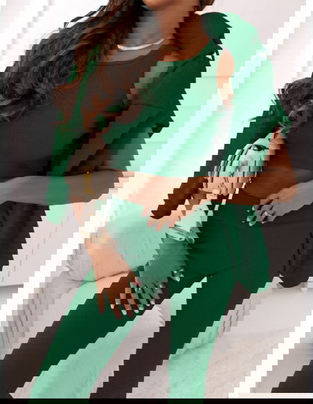 Komplet dresowy 3-częściowy Ivele - butelkowa zieleń Komplet dresowy 3-częściowy w odcieniu butelkowej zieleni to wyjątkowy i modny wybór, który łączy komfort z atrakcyjnym wyglądem.