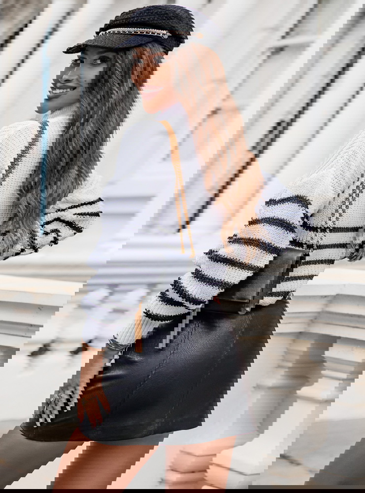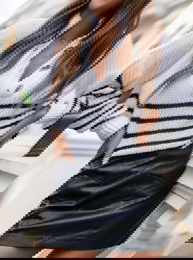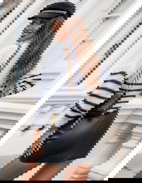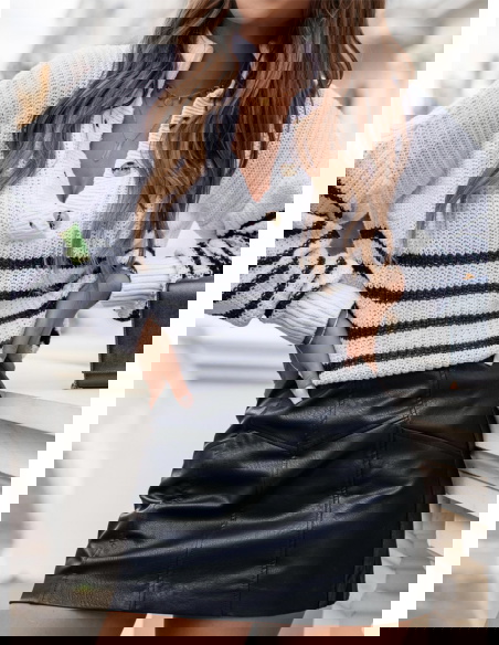To elegancki i stylowy element damskiej garderoby. Jego klasyczny fason i delikatny wzór w poziome paski nadają mu wyjątkowego uroku. Dodatkowo, guziki umieszczone przy dekolcie nadają mu subtelności i oryginalności. Wykonany z wysokiej jakości dzianiny, ten sweter jest miękki i komfortowy w noszeniu, zapewniając ciepło i wygodę w chłodniejsze dni.