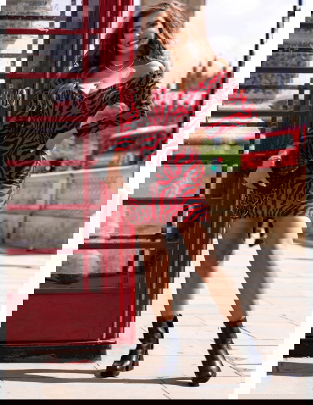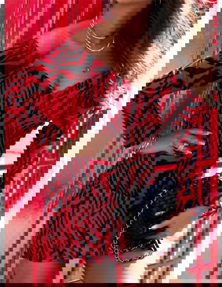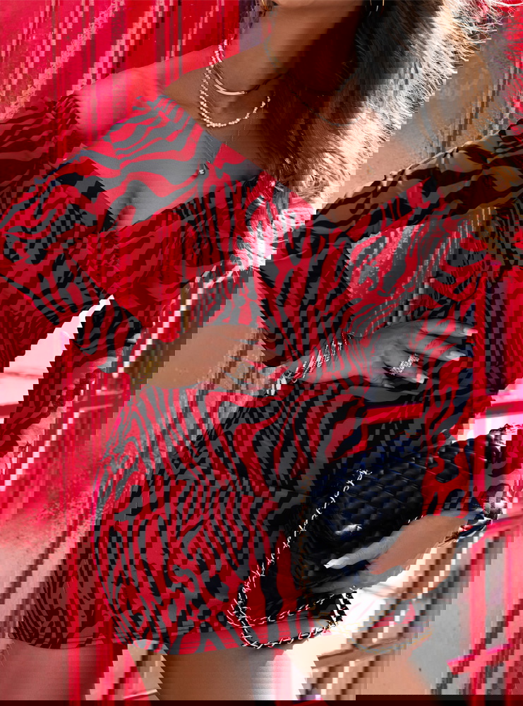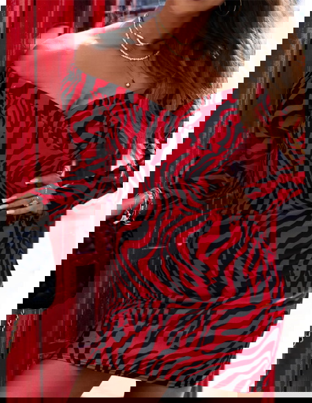 To wyjątkowy element garderoby o śmiałym wzorze zebry. Sukienka ta zachwyca intensywnym czerwonym kolorem, który przyciąga uwagę i nadaje jej wyrazistego charakteru. Jej dopasowany krój podkreśla kobiecą sylwetkę, a dekolt typu V dodaje elegancji i subtelnego uroku.