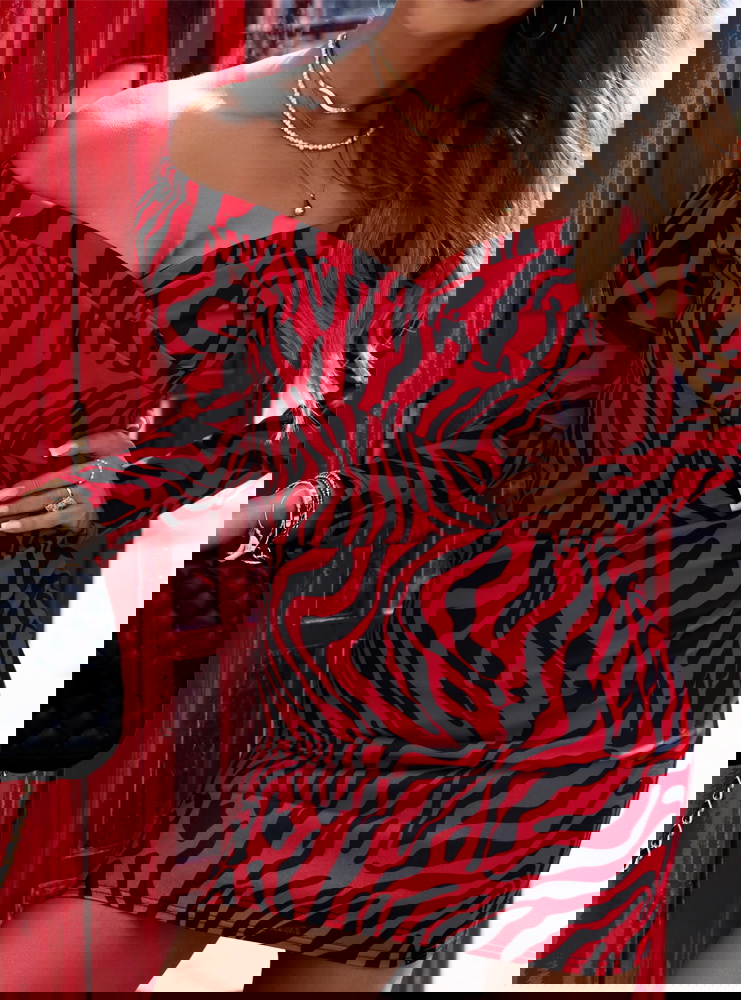 Wzorzysta dopasowana sukienka z dekoltem Nediaa - D5-2 Wzór zebry nadaje sukience unikalnego stylu i odważności, co czyni ją idealną na wiele okazji, od wieczornych spotkań po bardziej formalne wydarzenia.