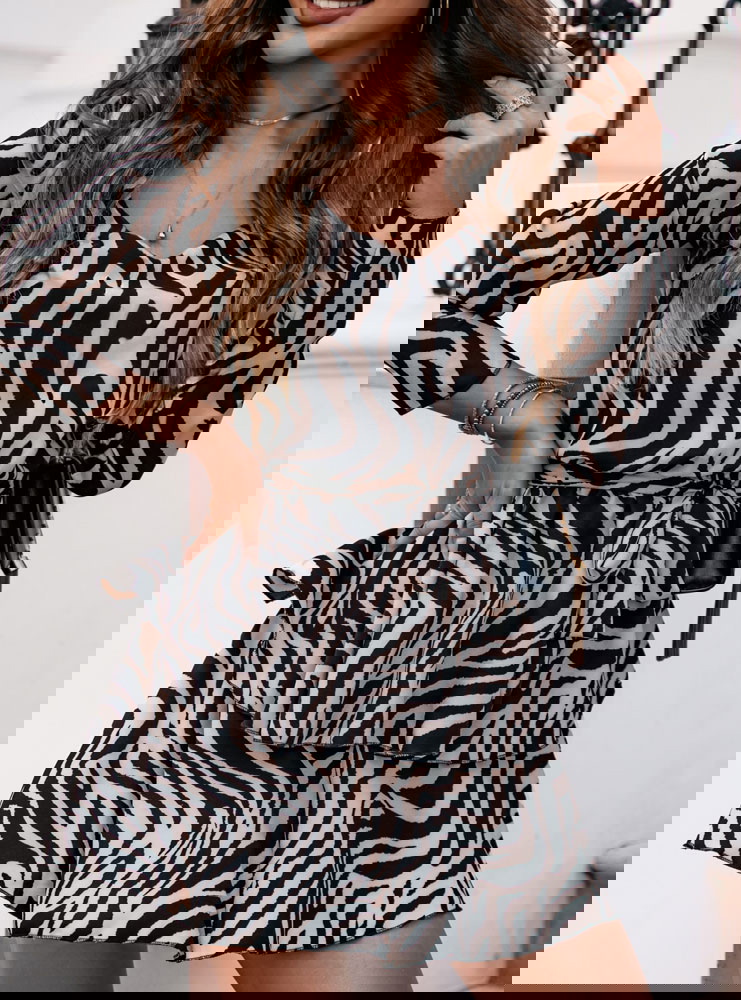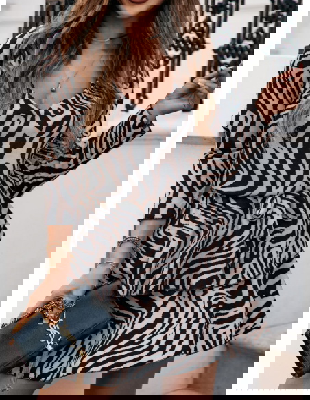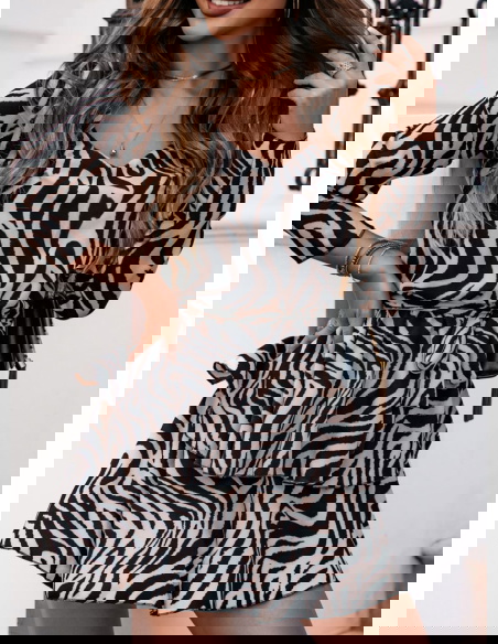 Wzorzysta sukienka z falbankami i wiązaniem w pasie Casarie - A2 To doskonały wybór dla kobiet ceniących odważne i modowe stylizacje, które z pewnością przyciągną spojrzenia i wywołają pozytywne reakcje. Wzorzysta sukienka Casarie w motyw zebry to wyrazista deklaracja mody i osobistego stylu, która doda charakteru każdej stylizacji.