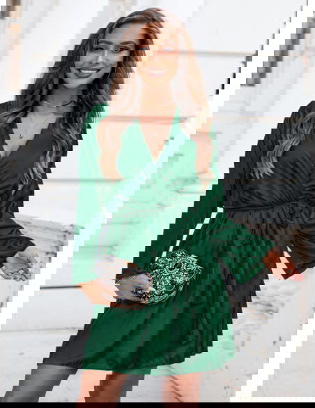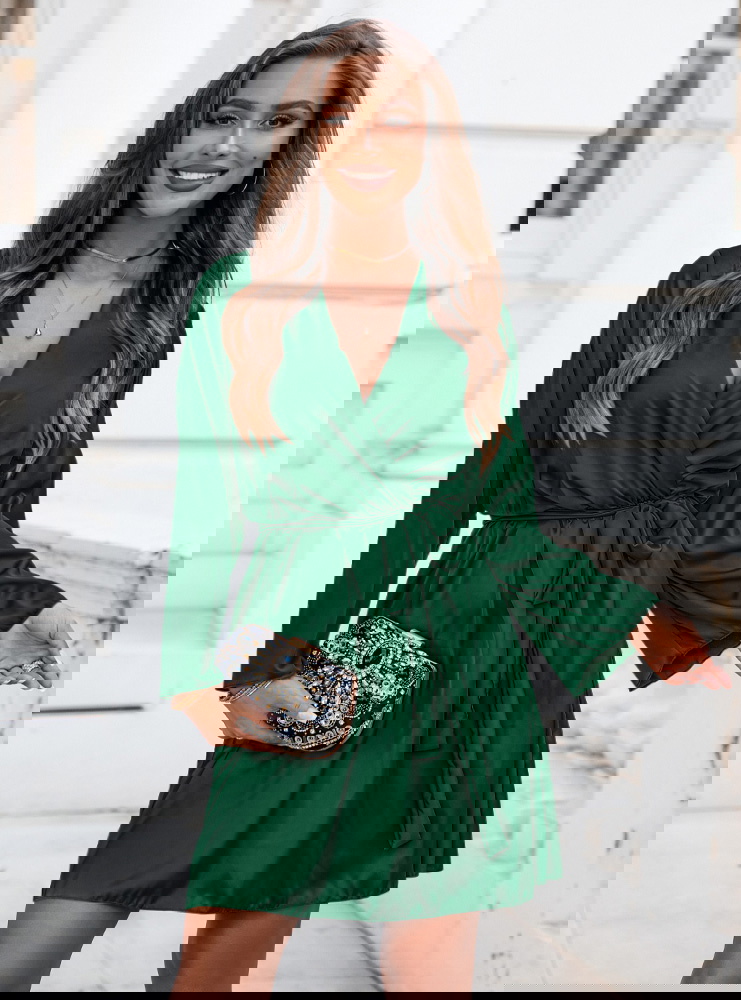 Satynowa sukienka z przekładanym dekoltem i paskiem Rebekka - butelkowa zieleń Taka sukienka doskonale sprawdzi się na wieczorne wyjścia, przyjęcia czy inne okazje, gdzie chcesz wyglądać wyjątkowo i jednocześnie czuć się komfortowo.