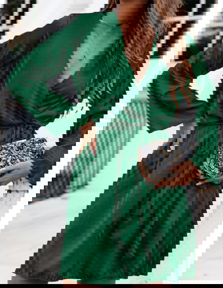 Satynowa sukienka z przekładanym dekoltem i paskiem Rebekka - butelkowa zieleń