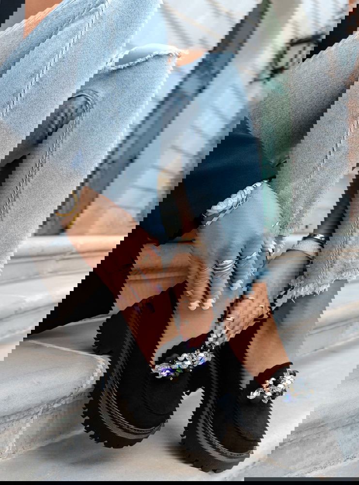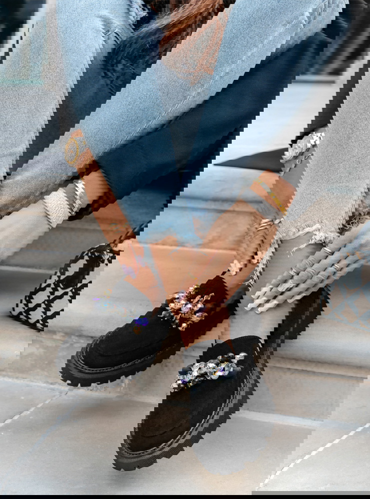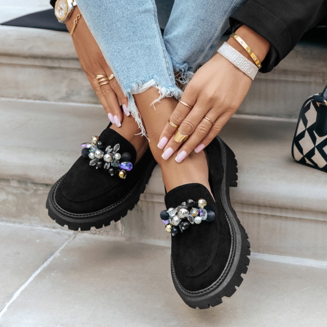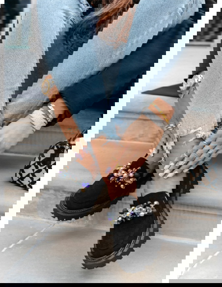 Czarne zamszowe mokasyny ozdobione perełkami to harmonijne połączenie elegancji z subtelnością. Miękki zamszowy materiał w kolorze czarnym nadaje obuwiu wyjątkową fakturę i styl, podczas gdy delikatne perełki dodają mu efektownego akcentu. Te mokasyny są idealnym wyborem dla osób, które pragną dodać nutę luksusu swoim codziennym lub bardziej formalnym strojom.