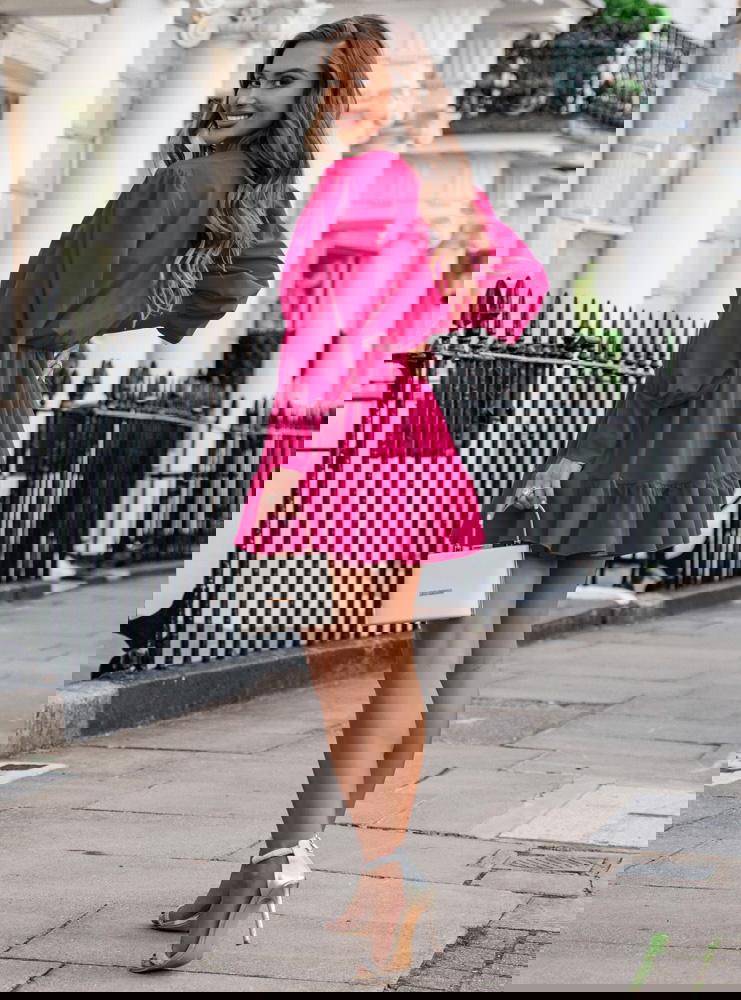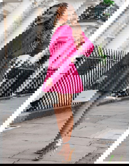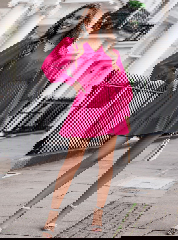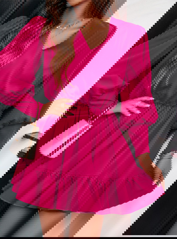 Sukienka z falbaną i bufiastymi rękawami Solekka - fuksja To kolor idealny na wieczorne wyjścia, przyjęcia czy inne specjalne okazje, gdzie chcesz zrobić niezapomniane wrażenie.