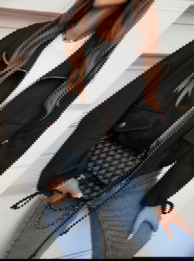 Czarna zamszowa kurtka z kieszeniami Astina To doskonała propozycja dla miłośniczek luksusowych materiałów i uniwersalnej mody.