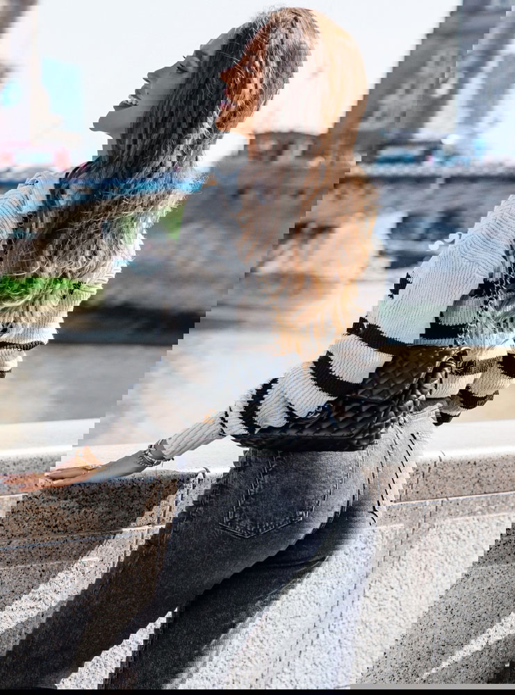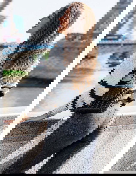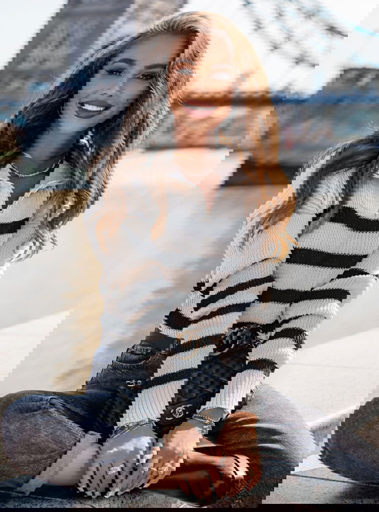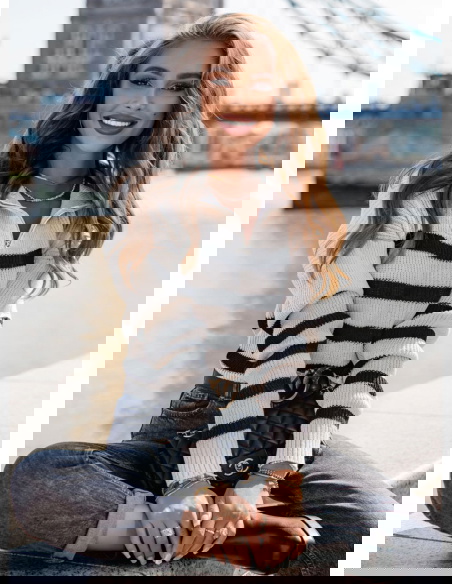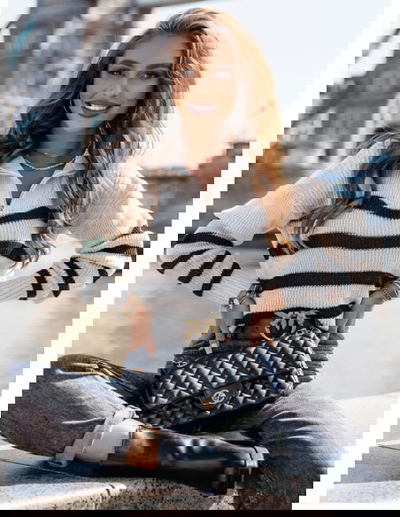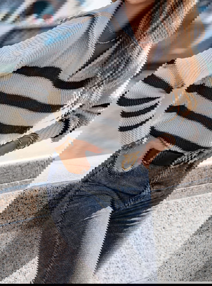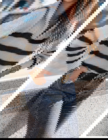 Czarne paski na beżowym tle dodają swetrowi wyrazistości i charakteru, a wysoki golf jest nie tylko modny, ale także praktyczny w chłodniejsze dni. Ten sweter nadaje się zarówno do codziennych, jak i bardziej formalnych okazji, co czyni go wszechstronnym elementem garderoby.