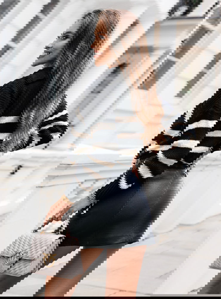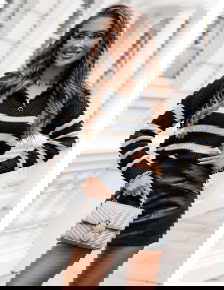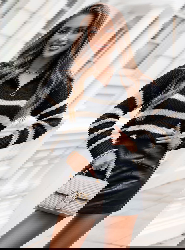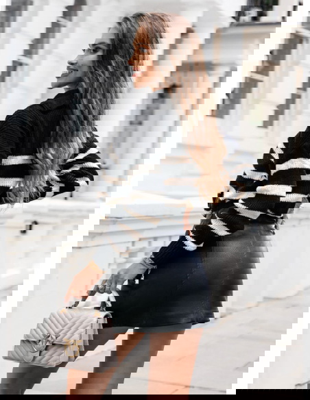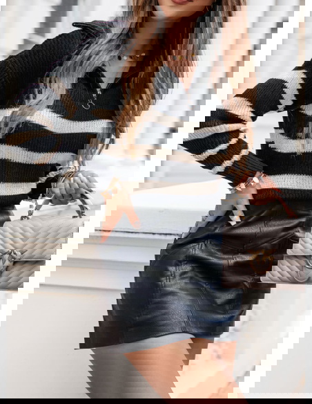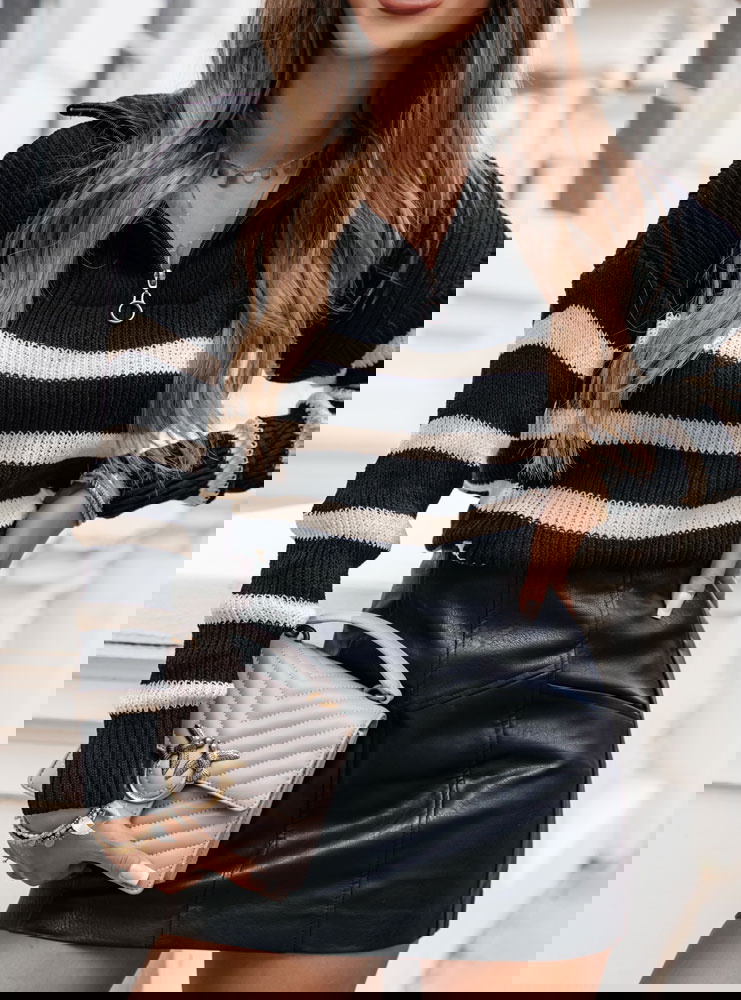 Czarny sweter w brązowe paski z wysokim golfem to połączenie elegancji i subtelnego uroku. Ten sweter emanuje klasyką, jednocześnie wprowadzając nutkę ciepłego kontrastu dzięki brązowym paskom. Brązowe paski na czarnym tle nadają swetrowi wyrazistości i oryginalności. Wysoki golf dodaje mu elegancji i idealnie sprawdza się w chłodniejsze dni, chroniąc szyję od wiatru.