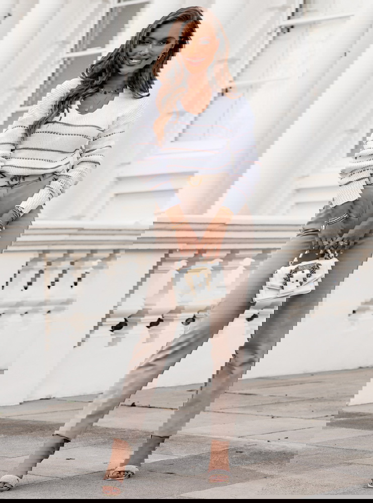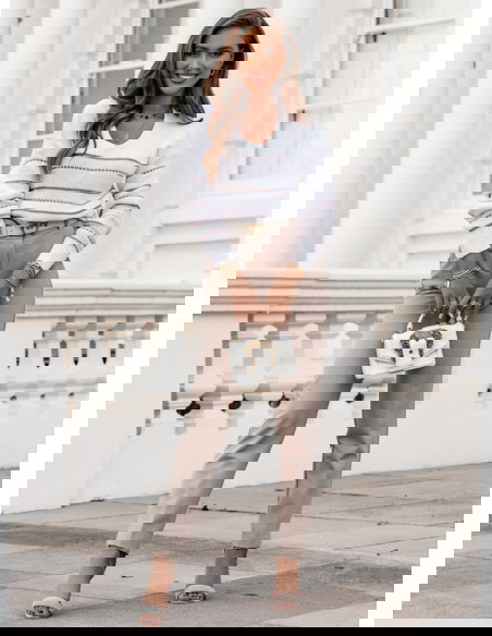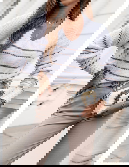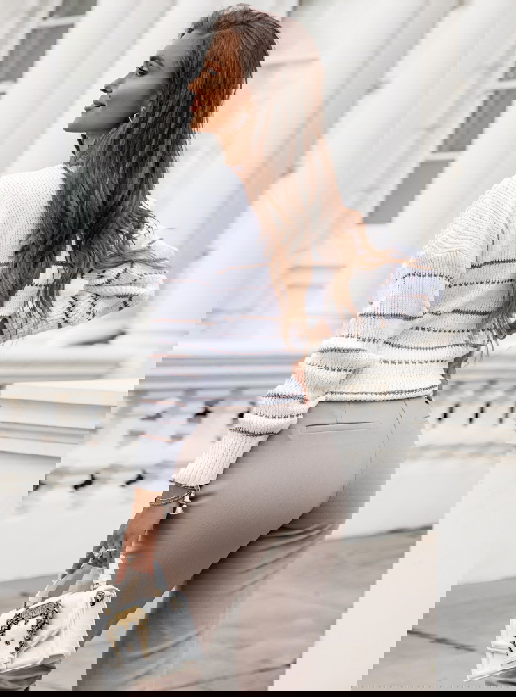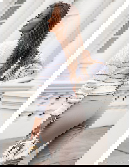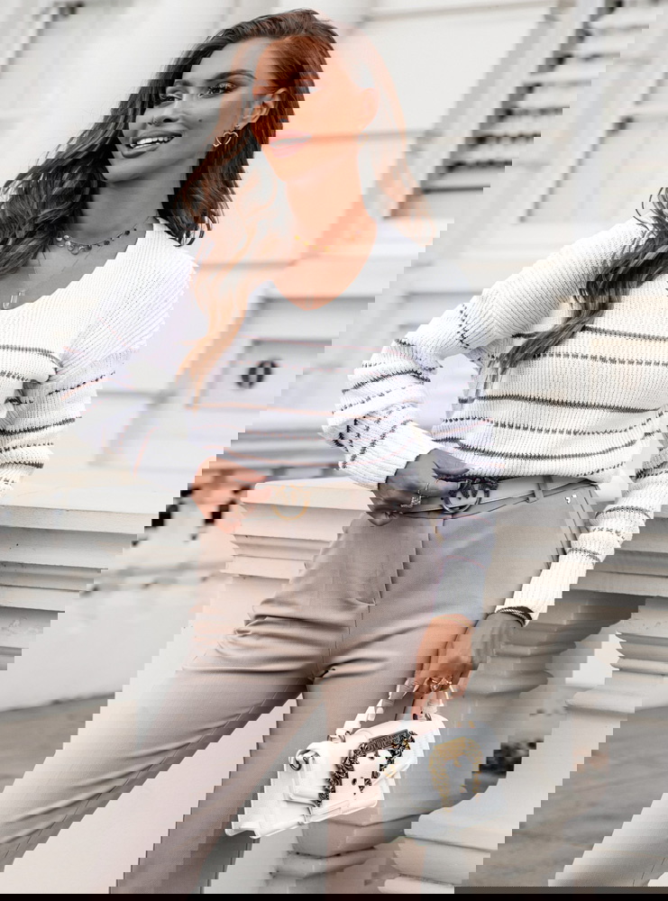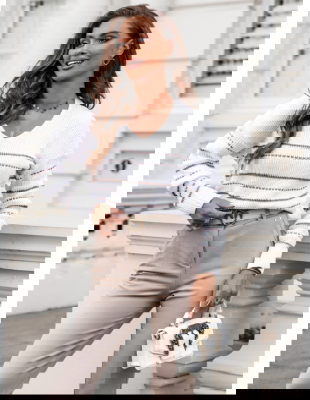 Biały sweter w beżowe paski to wyjątkowy element garderoby, który łączy w sobie klasyczną elegancję z odrobiną ekstrawagancji. Ten sweter to prawdziwy klasyk, który zyskuje dodatkowy efekt dzięki beżowym paskom. Beżowe paski nadają swetrowi charakteru i wyrazistości. To wzór, który zawsze pozostaje na czasie i jest doskonałym wyborem na wiele okazji.