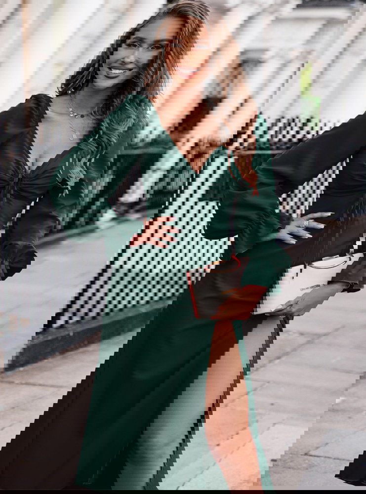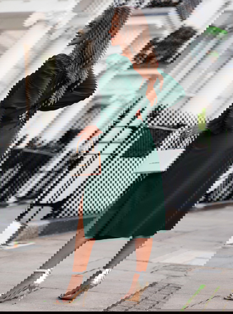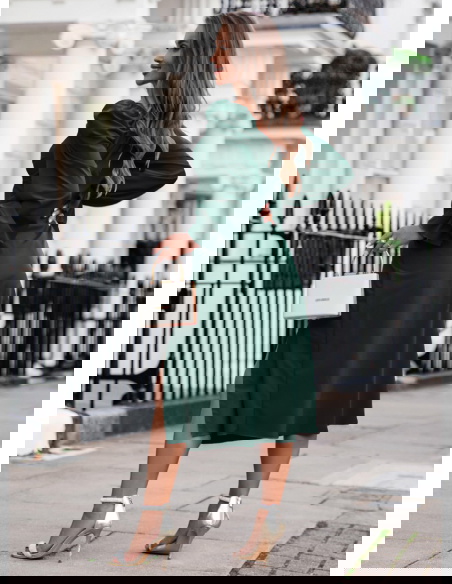 To połączenie elegancji i subtelnej śmiałości. Jej butelkowozielony kolor dodaje głębi i wyjątkowego charakteru. Wysoki dekolt z wiązaniem stanowi efektowny akcent, który przyciąga uwagę.