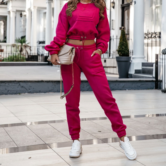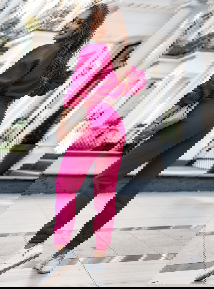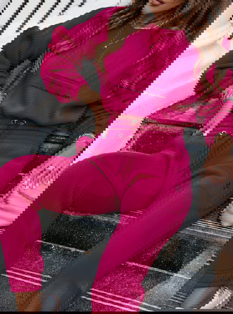 Ten zestaw składa się z krótkiej bluzy i spodni, które doskonale łączą w sobie wygodę z nowoczesnym designem. Krótka bluza w jaskrawym odcieniu fuksji jest zgrabnie skrojona, podkreślając sylwetkę i jednocześnie pozwalając na swobodę ruchu. Zawiera ściągacze na rękawach, które dodają jej nutkę trendy stylu. Spodnie w komplecie również posiadają ściągacze na nogawkach, co nadaje im nowoczesny charakter i pozwala na dostosowanie ich długości według własnych preferencji. Intensywna fuksja nadaje zestawowi energetycznego wyrazu, a elastyczny pas z regulacją gwarantuje wygodę noszenia przez cały dzień.