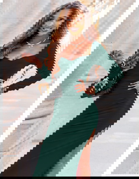 Długa sukienka z rozcięciem i ozdobnymi marszczeniami Clementine - butelkowa zieleń