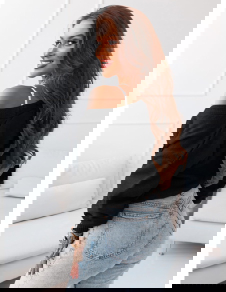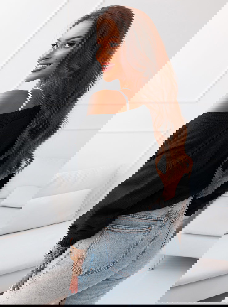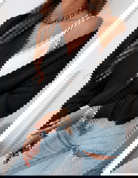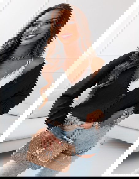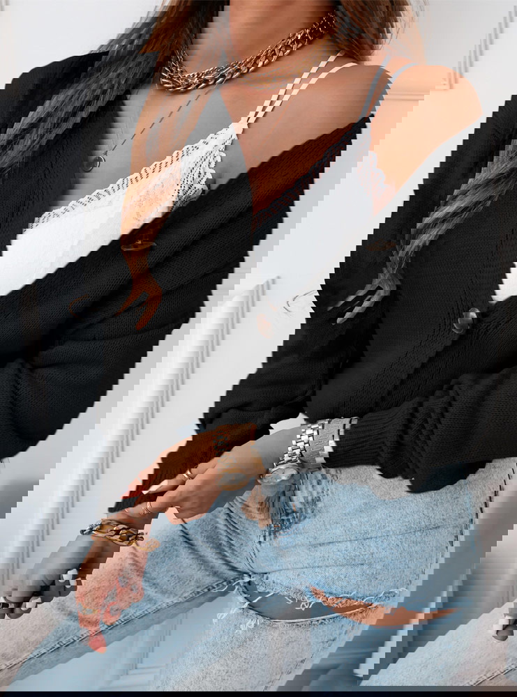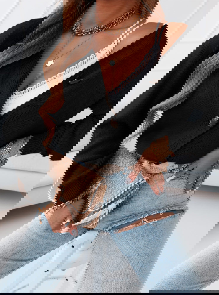 To klasyczny, czarny sweter zapinany na guziki, który łączy w sobie elegancję i komfort. Wykonany jest z miękkiej, ciepłej dzianiny, która doskonale nadaje się na chłodniejsze dni. Guziki dodają swetrowi wyrafinowanego charakteru i pozwalają na regulację głębokości dekoltu.
