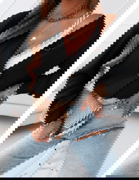 Czarny sweter zapinany na guziki Hausis Sweter ma długie rękawy, które zapewniają ciepło i wygodę. Idealny zarówno do noszenia na co dzień, jak i do bardziej formalnych okazji.