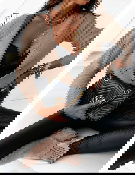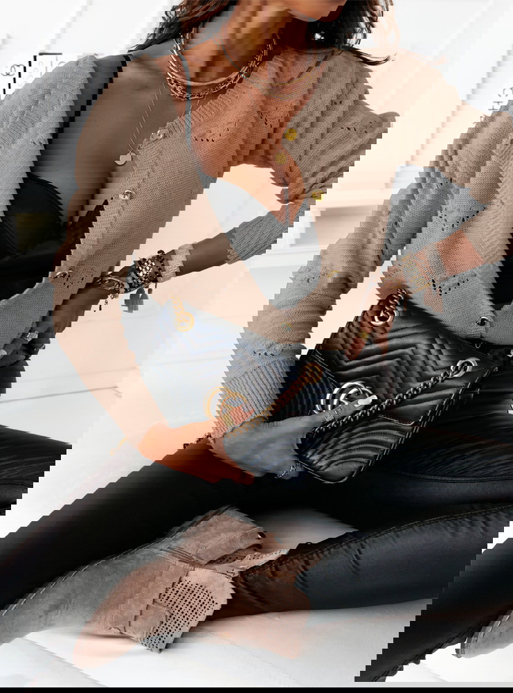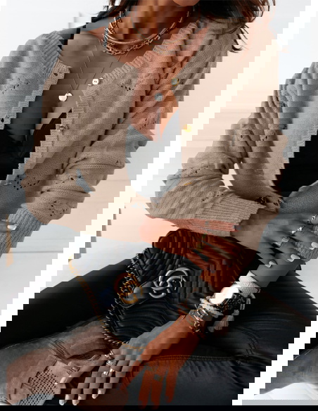 Sweterek Arrie to niezwykle wdzięczny element garderoby, który pozwoli Ci stworzyć świeże i eleganckie stylizacje. Jest wykonany z delikatnej dzianiny o ażurowym splocie, co sprawia, że jest doskonały na cieplejsze dni. Kolor latte to delikatny odcień beżu, który dodaje swetrowi subtelności i klasy. Sweterek ma rozpinany fason, co ułatwia zakładanie i zdejmowanie, a także pozwala regulować głębokość dekoltu.