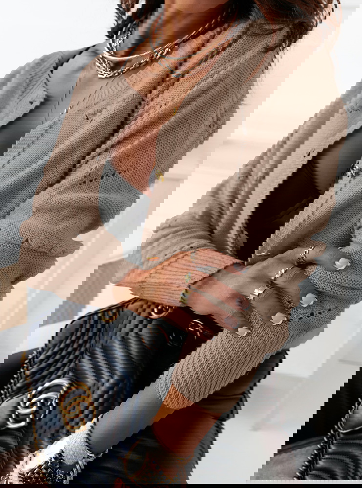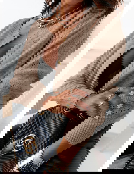 Rozpinany sweterek o ażurowym splocie Arrie - latte To idealny wybór na wieczorne spotkania, randki czy letnie spacery.