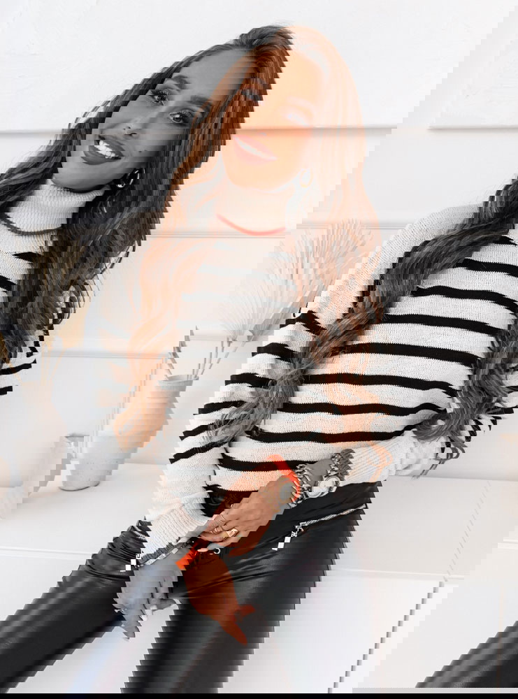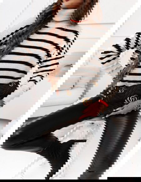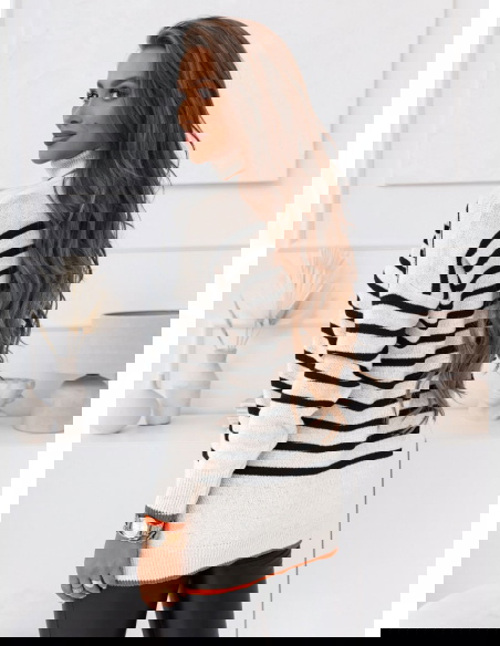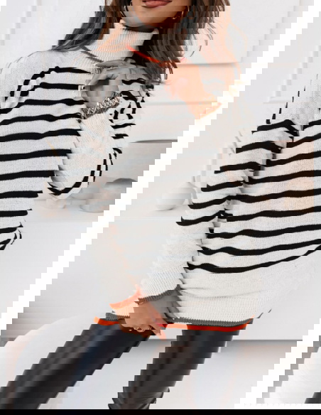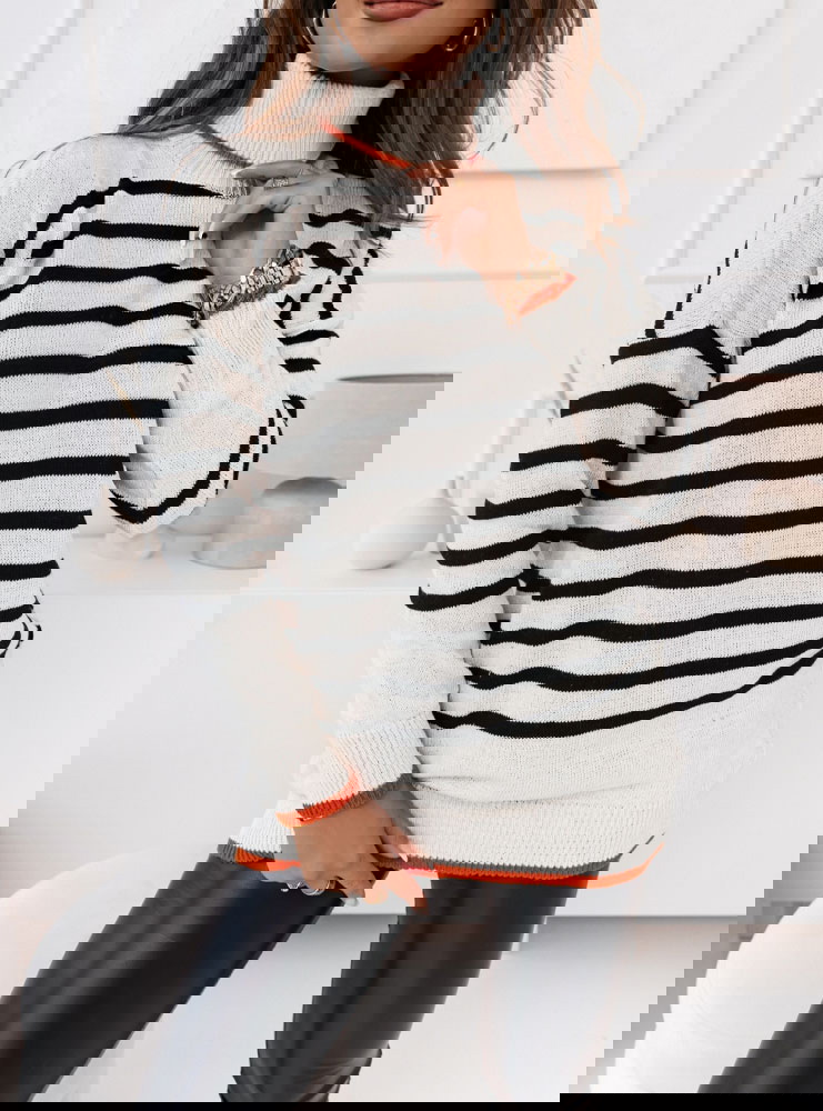 Beżowy sweter w paski z golfem Otillie - wzór 2 Sweter ma luźny krój, który zapewnia wygodę noszenia, a długie rękawy ochraniają przed zimnem.