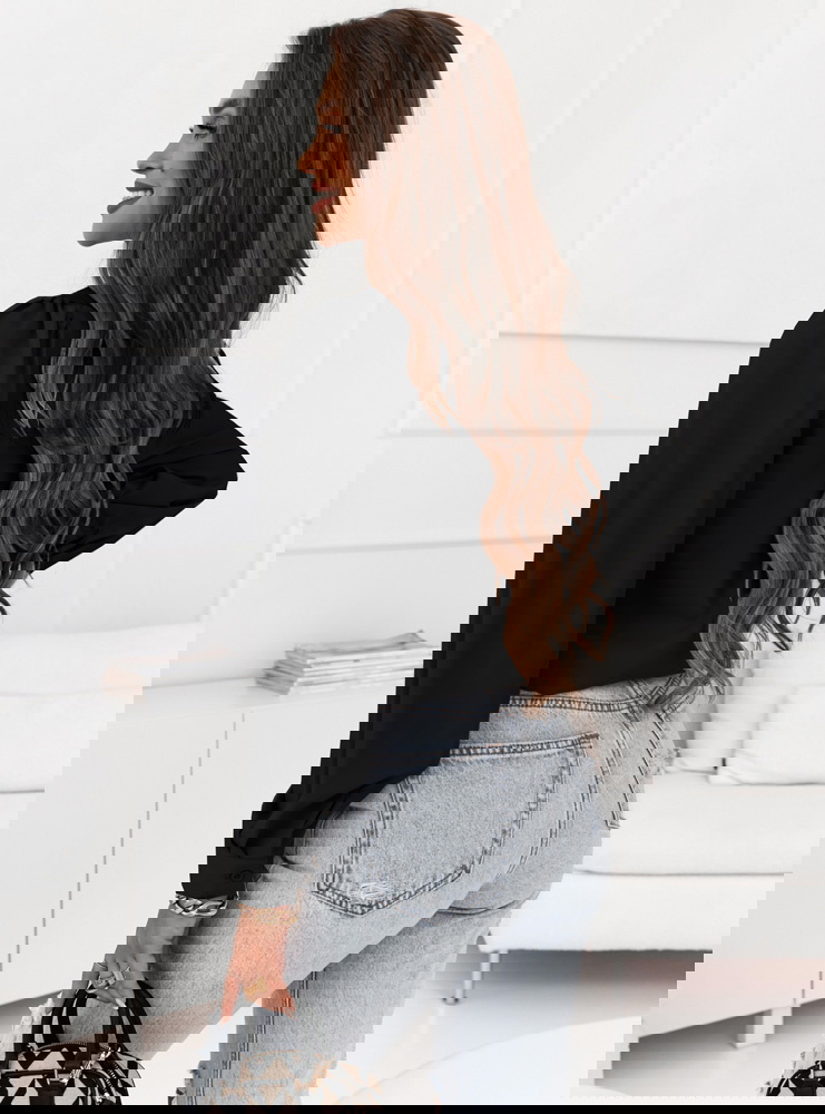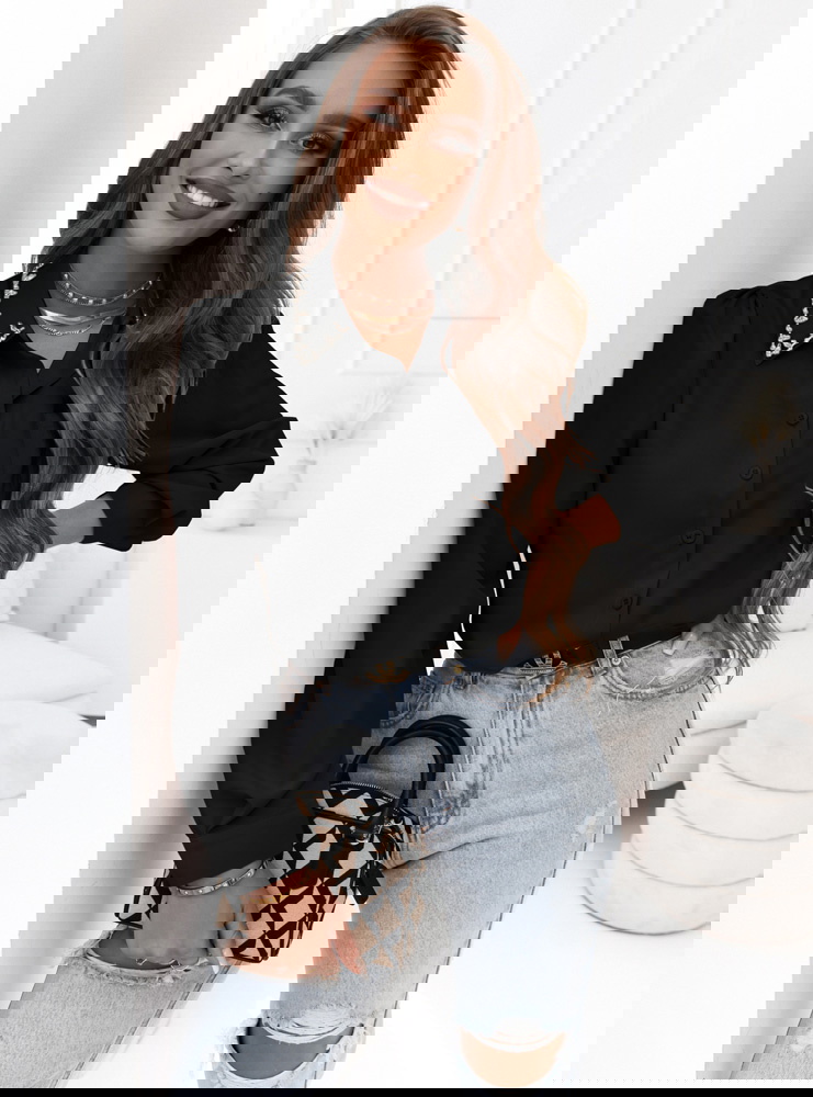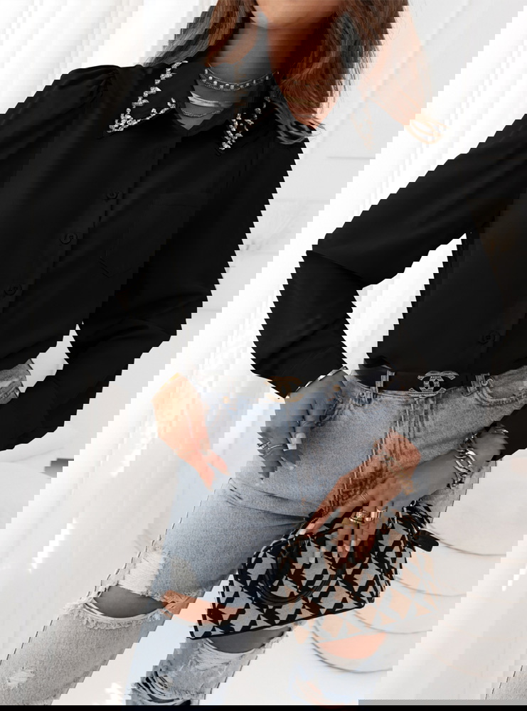 Czarna koszula z ozdobnym kołnierzykiem Vieska To niezwykle uniwersalny element garderoby, który podkreśla wyjątkowy styl i pewność siebie noszącej ją osoby.