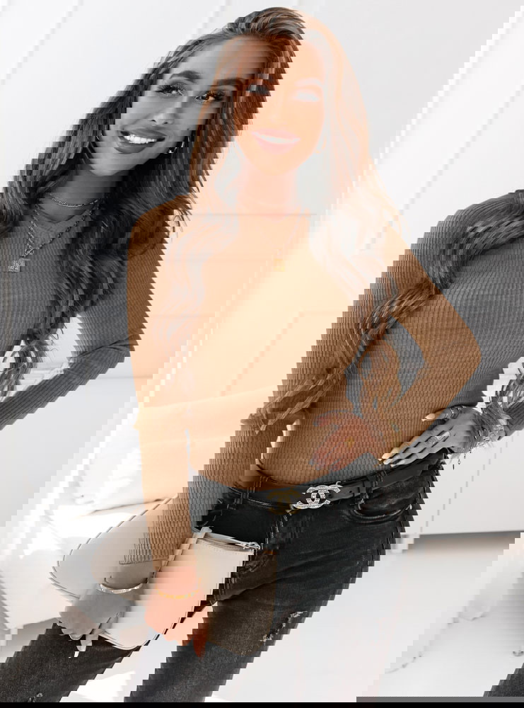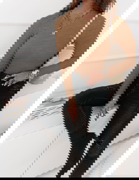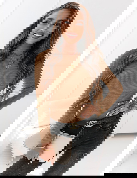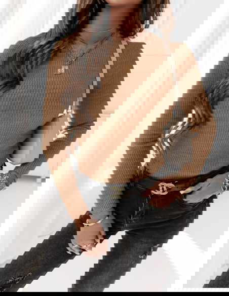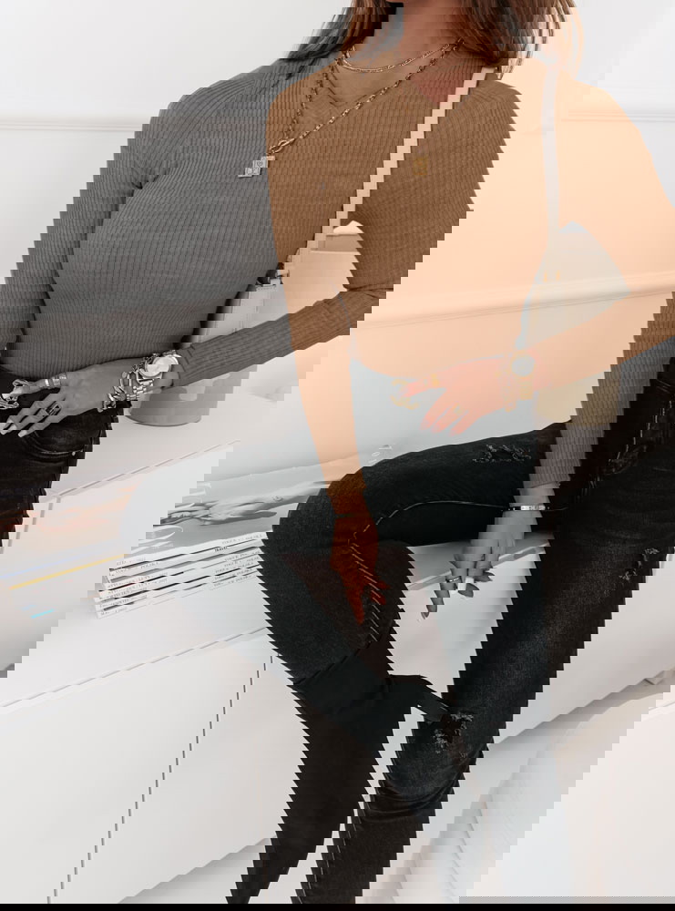 Sweterek prążkowany z dekoltem V Sarah - odcienie brązu Ten sweterek doskonale sprawdzi się jako element codziennych, jesiennych i zimowych stylizacji