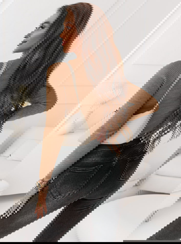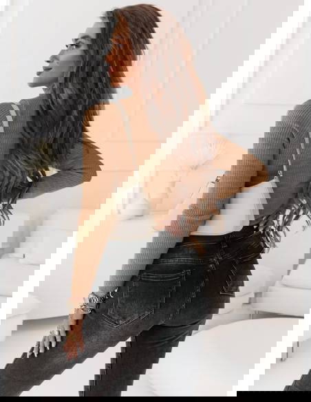 Głównym elementem tego swetra są prążki, które nadają mu teksturalny wygląd i dodają elegancji. Prążkowany wzór tworzy delikatny wzór na powierzchni swetra, nadając mu wyjątkowy wygląd. Dekolt w kształcie litery V to szczegół, który jest zarówno kobiecy, jak i elegancki. Dekolt ten pięknie eksponuje szyję i dekolt, nadając swetrowi subtelny urok.