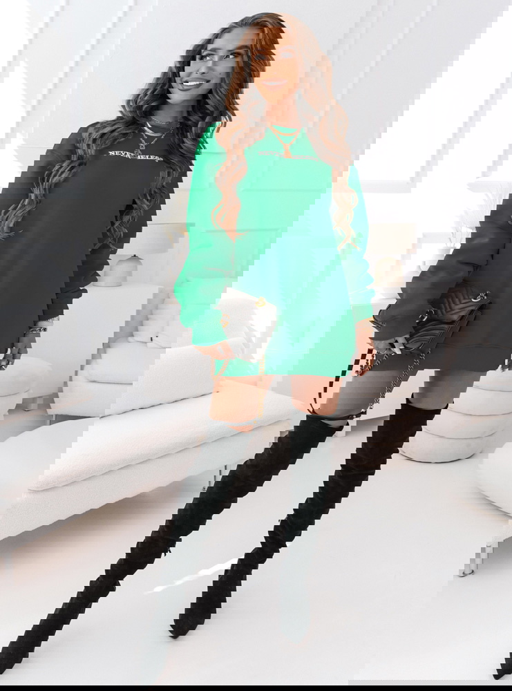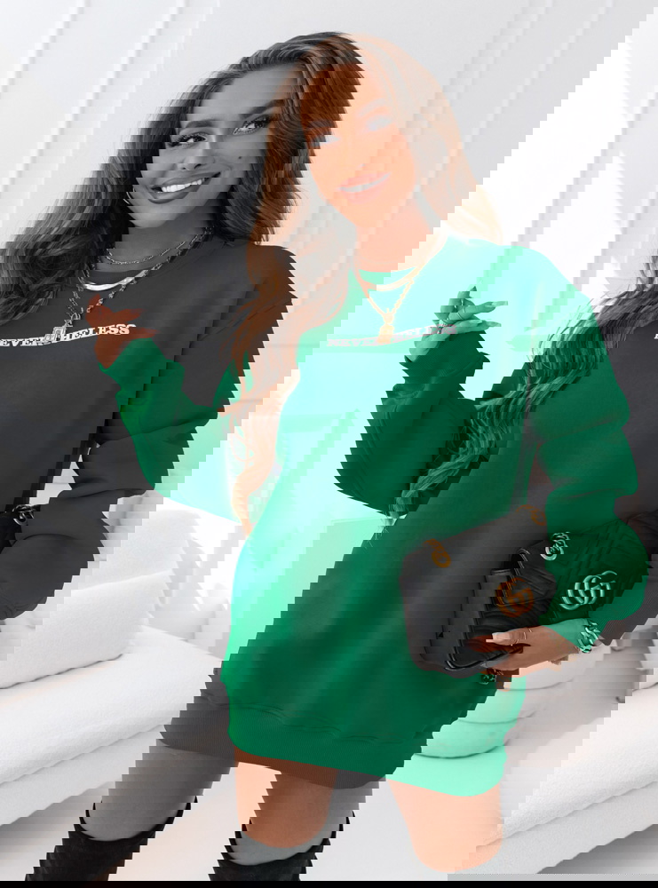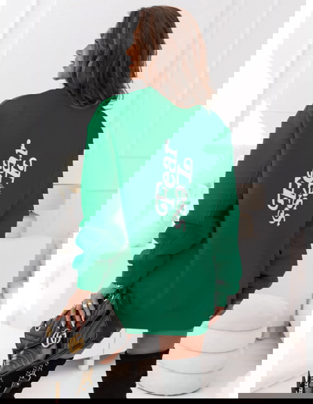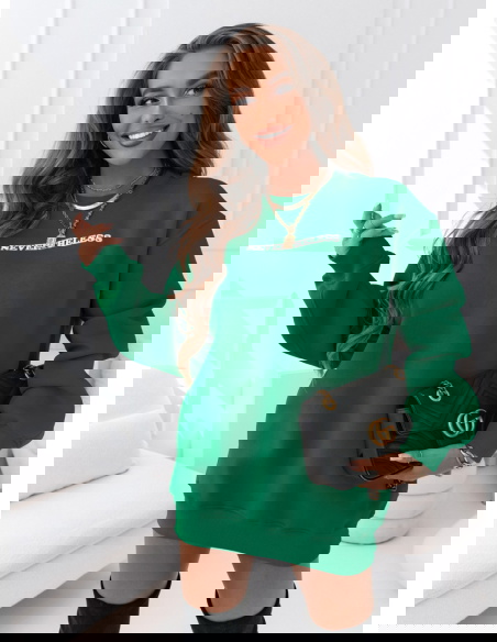 Długa bluza sportowa z napisami Syntia - butelkowa zieleń Kolor butelkowej zieleni dodaje bluzie energii i świeżości, co sprawia, że jest doskonałym wyborem.
