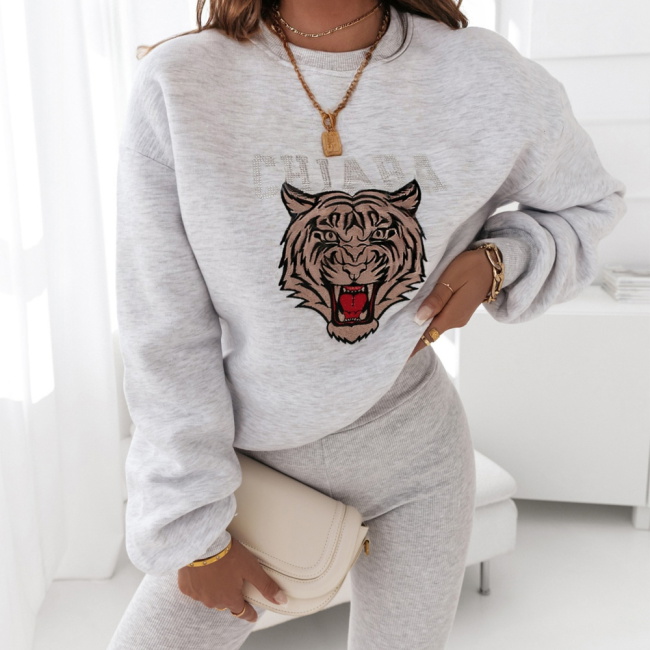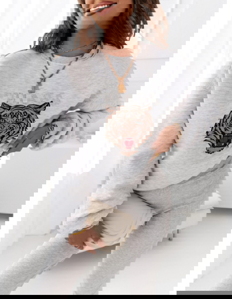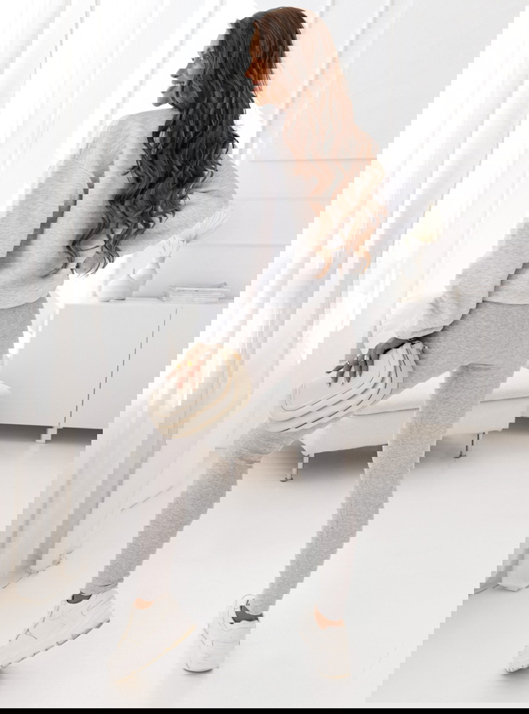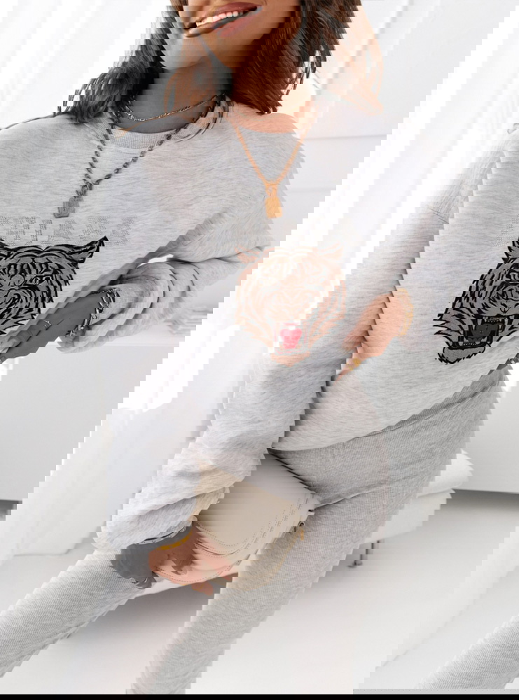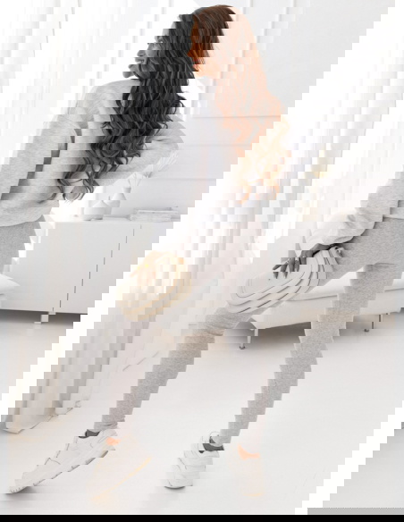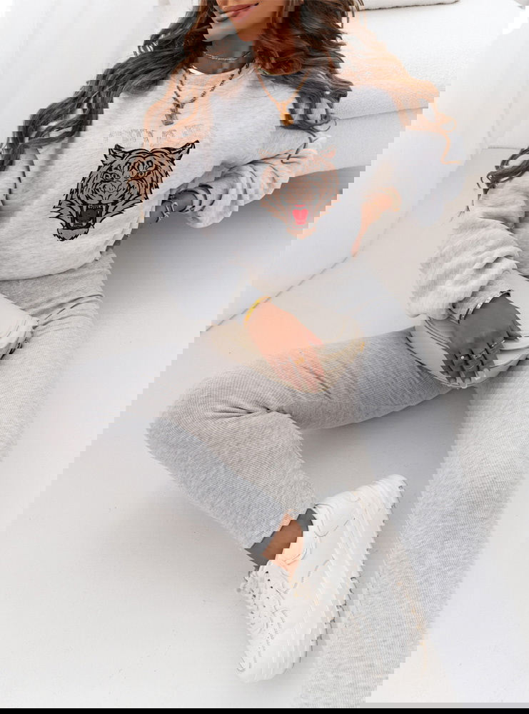 Szary komplet dresowy z legginsami Sorca Jego neutralny design pozwala na różnorodne kombinacje, dodając im lekkości i swobodnego charakteru.