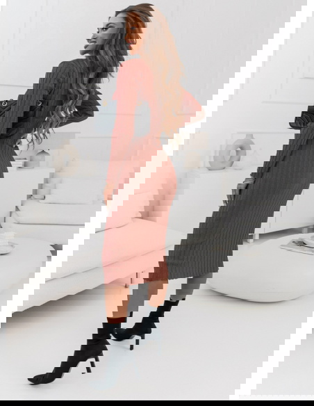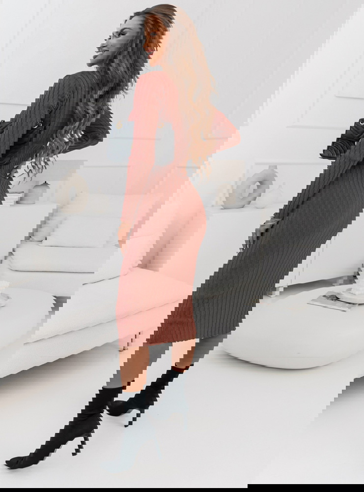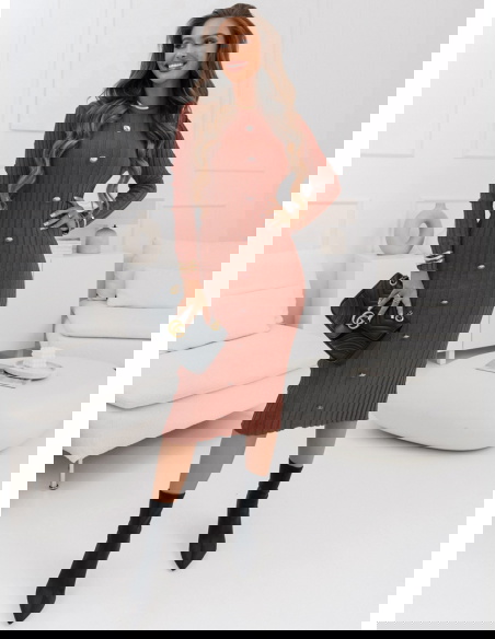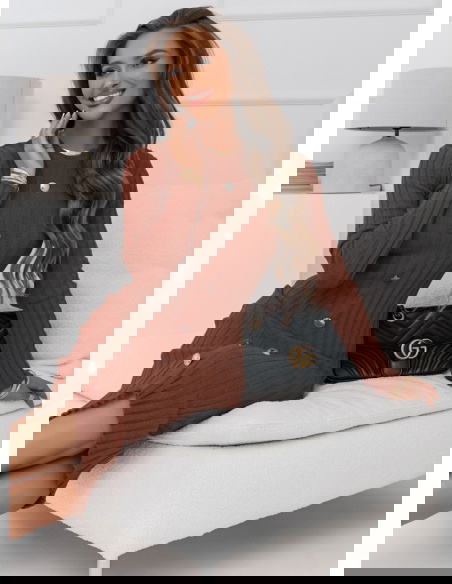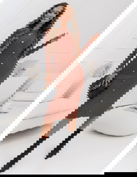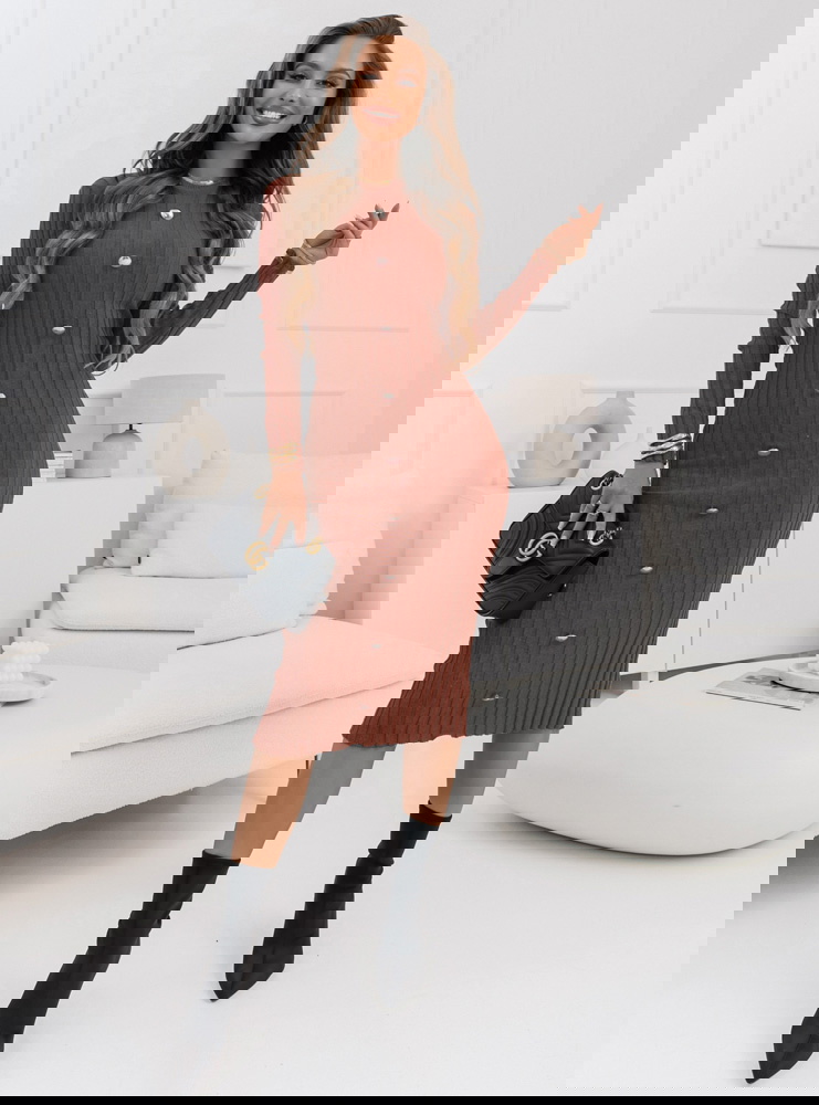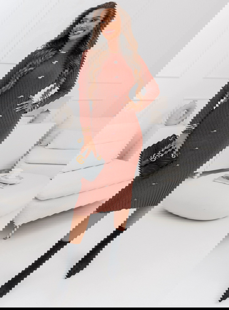 Ceglasta sweterkowa prążkowana sukienka z ozdobnymi guzikami Myra Kolor sukienki doskonale komponuje się z czarnymi dodatkami, łącząc w sobie ciepło i styl.