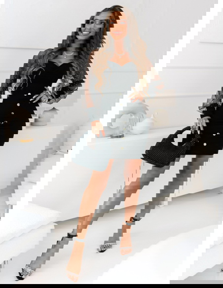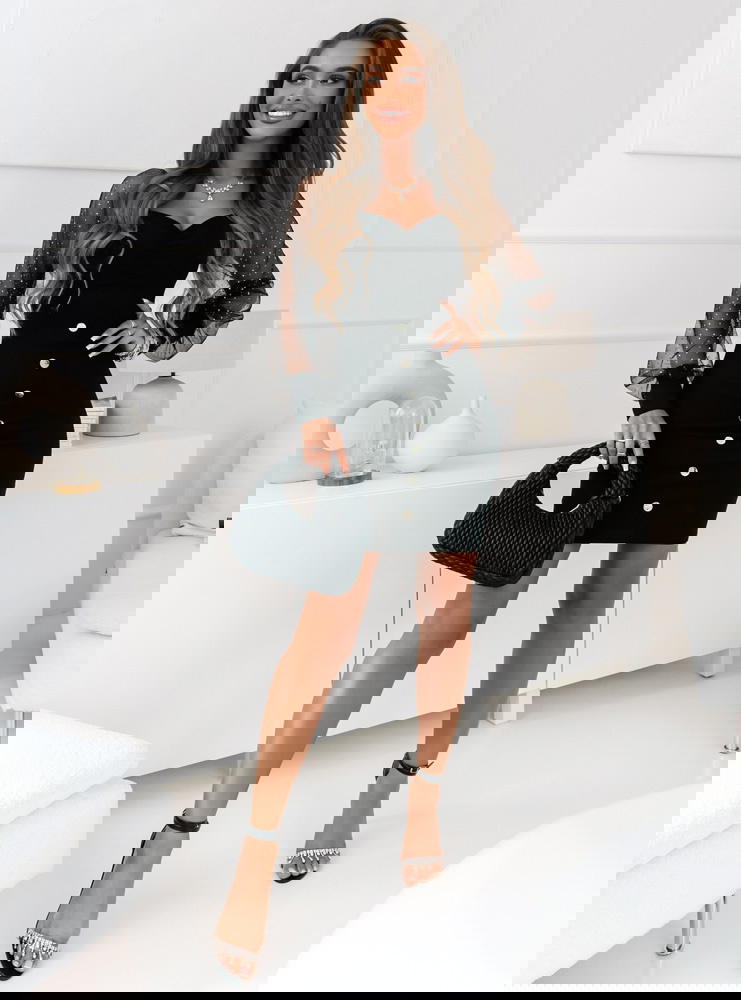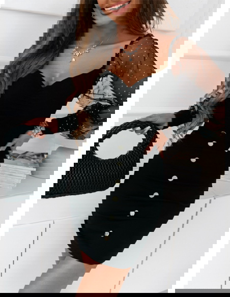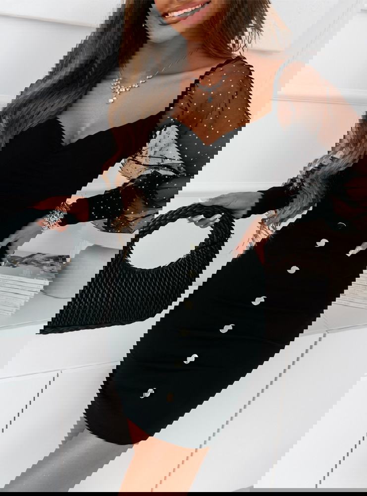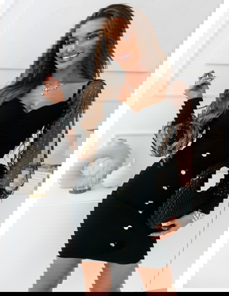 Ta czarna sukienka prezentuje się wyjątkowo elegancko i stylowo.Wyjątkowym elementem są przezroczyste rękawy z delikatnymi złotymi kropkami, które nadają jej oryginalności. Złote guziki umieszczone pionowo na froncie dodają charakteru i nowoczesności. Krótka długość sprawia, że idealnie nadaje się na wieczorne wyjścia. Materiał, z którego została wykonana, jest gładki i elastyczny, gwarantując komfort noszenia. Dopasowany krój idealnie podkreśla kształty, nie krępując ruchów. Efektowne mankiety na końcach rękawów są ozdobione błyszczącymi aplikacjami.