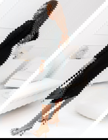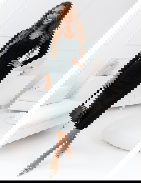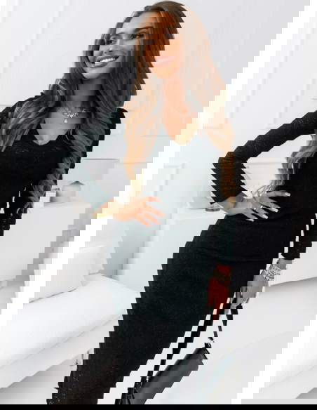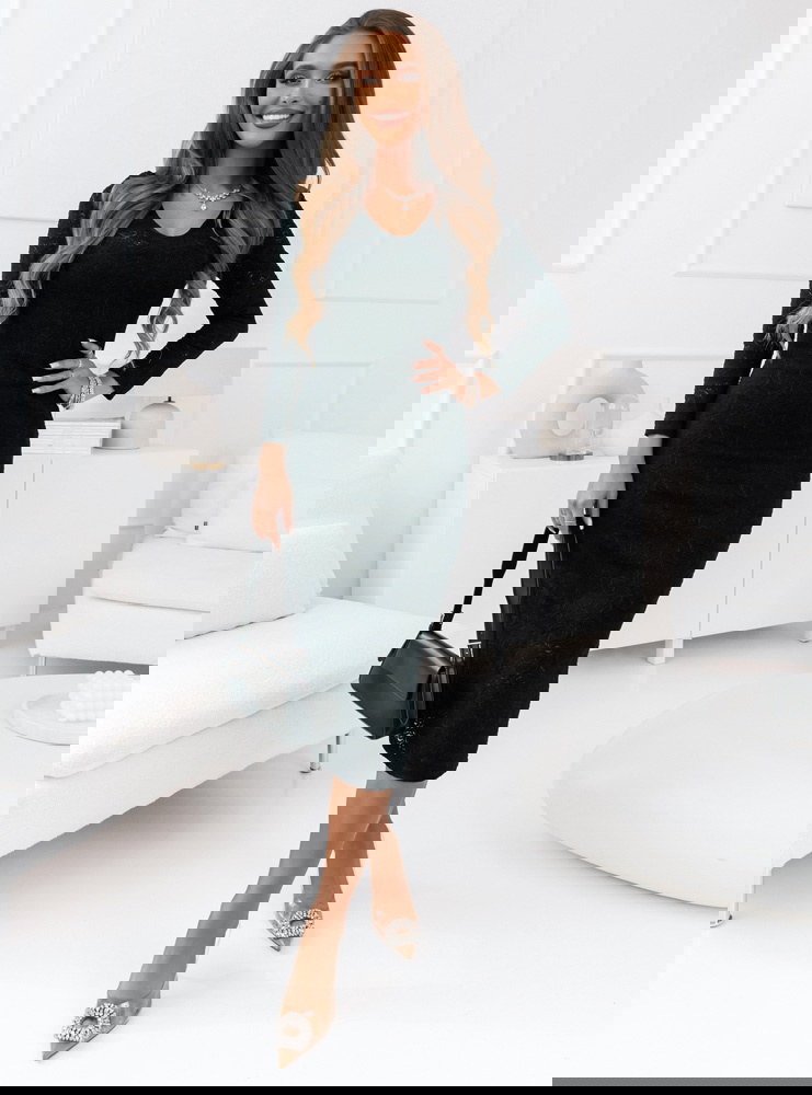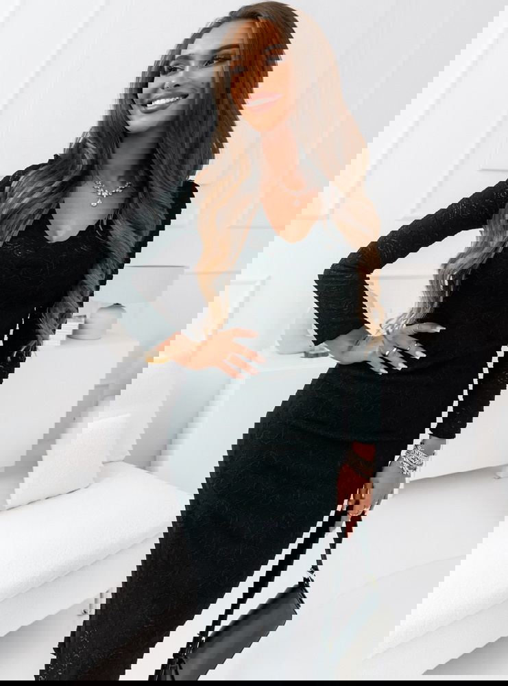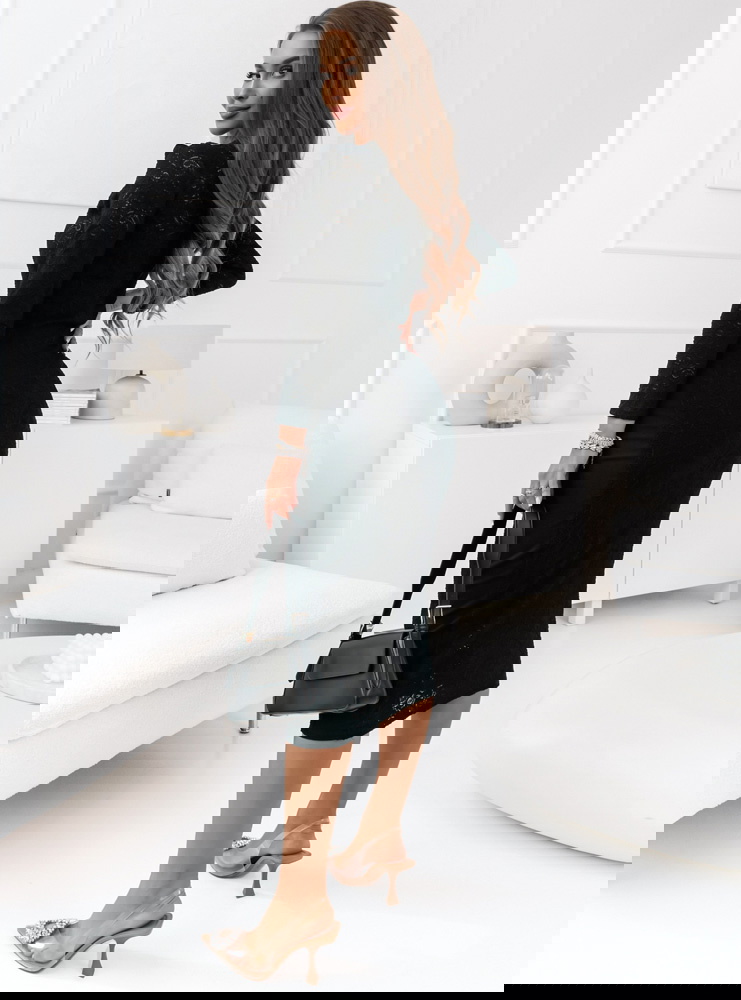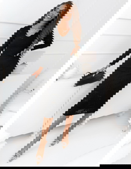 Klasyczna czarna sukienka o dopasowanym kroju, uszyta z wysokiej jakości koronki z delikatnym wzorem. Design sukienki podkreśla walory sylwetki, a długość midi dodaje jej uniwersalności i elegancji. Długie rękawy oraz subtelny dekolt harmonijnie dopełniają całość, tworząc look idealny na wieczorne wyjścia czy ważne okazje.