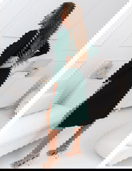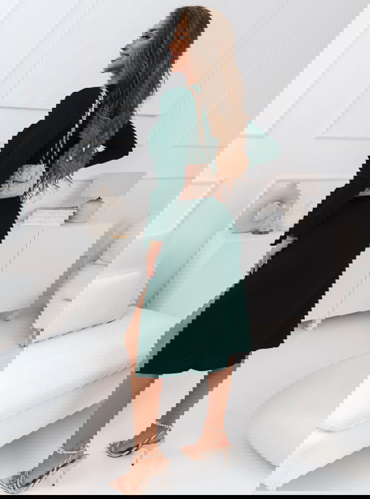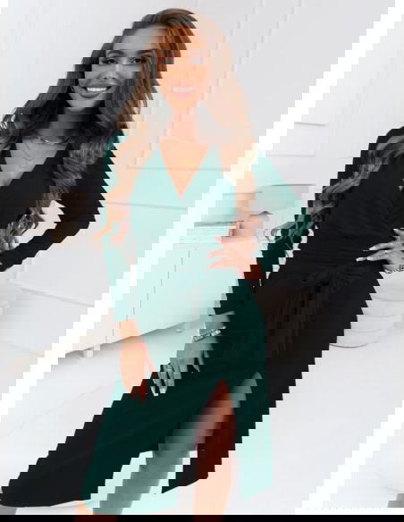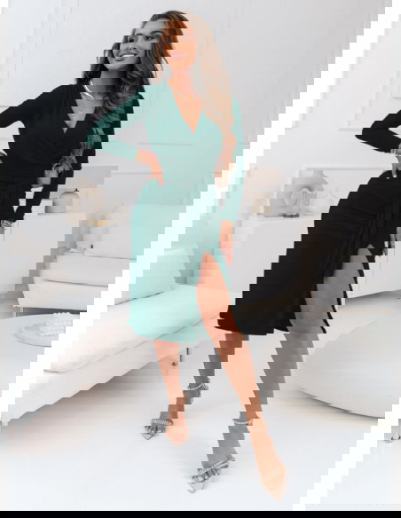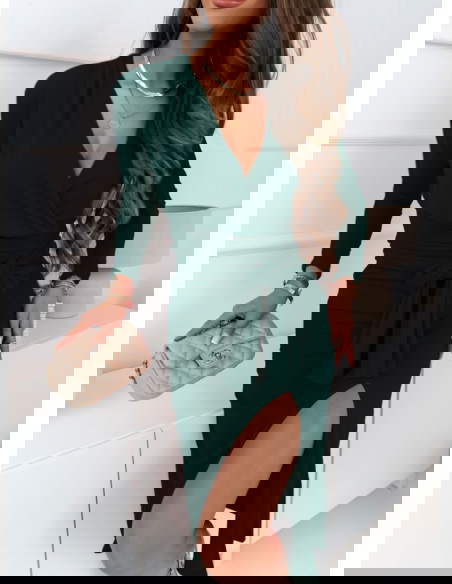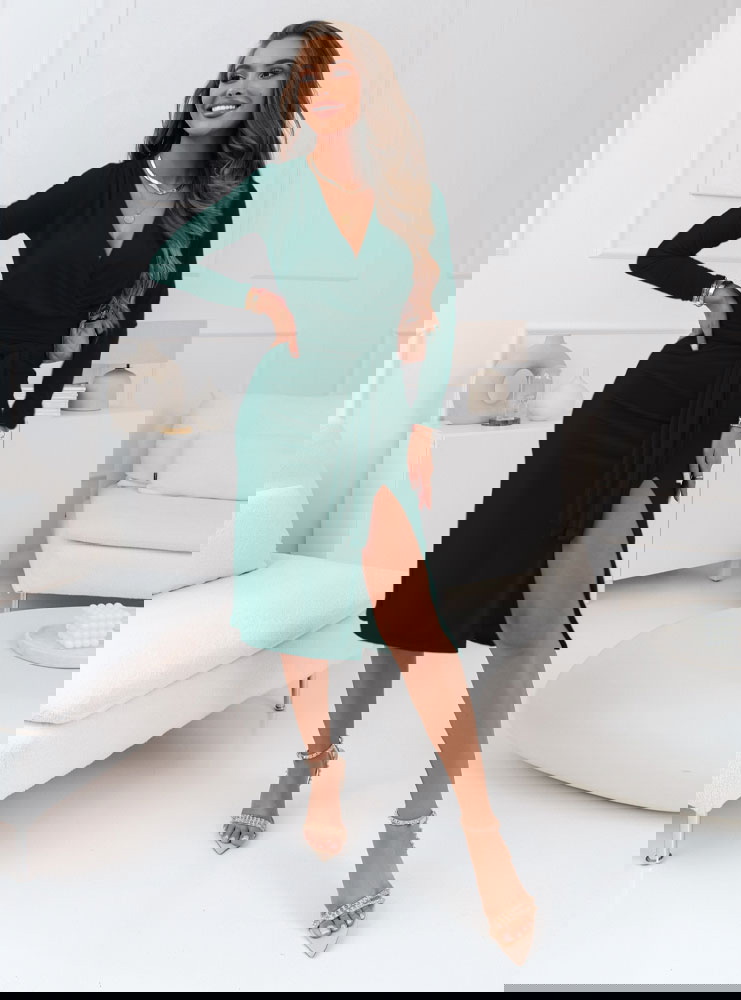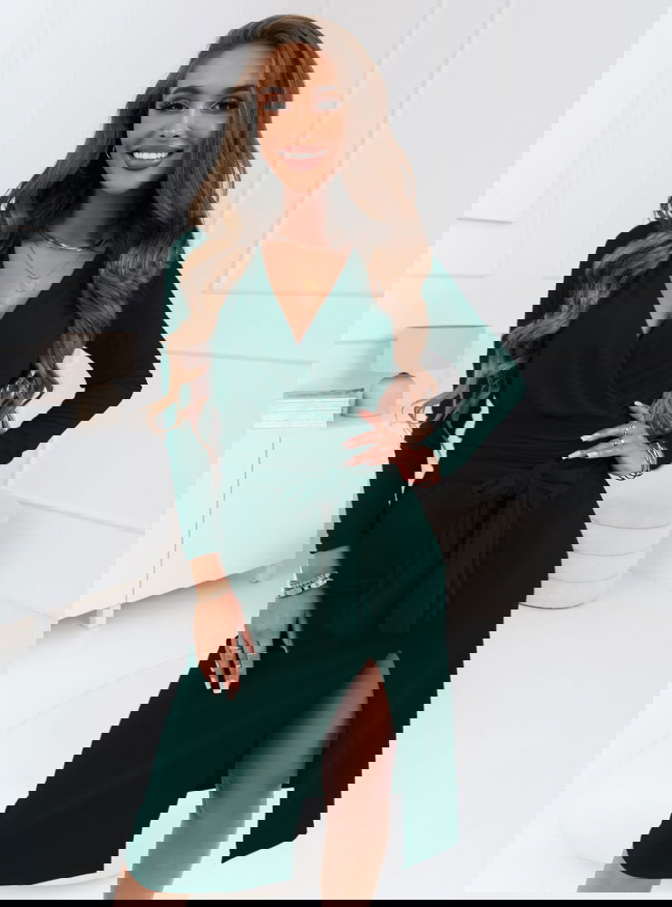 Ta sukienka w odcieniu butelkowej zieleni przyciąga wzrok emanując elegancją i tajemniczością. Jej dopasowany krój z przekładanym dekoltem doskonale podkreśla talię, nadając sylwetce harmonijny kształt. Długość midi dodaje jej wytworności, podczas gdy odważne rozcięcie dodaje całości zmysłowości i nowoczesnego charakteru. Długie rękawy świetnie komplementują głęboki dekolt w kształcie litery V, a całość idealnie dopełnią subtelne dodatki, kontrastujące z głębią koloru.