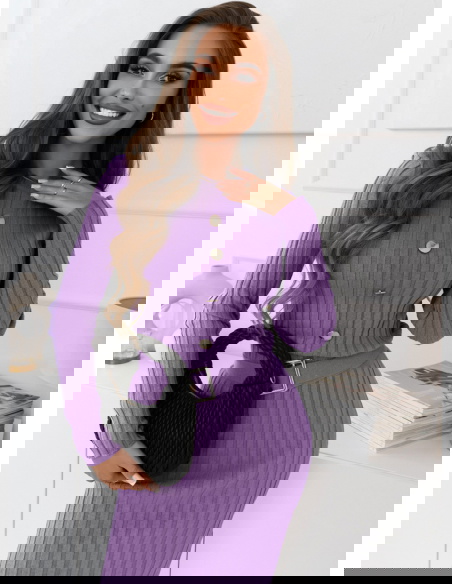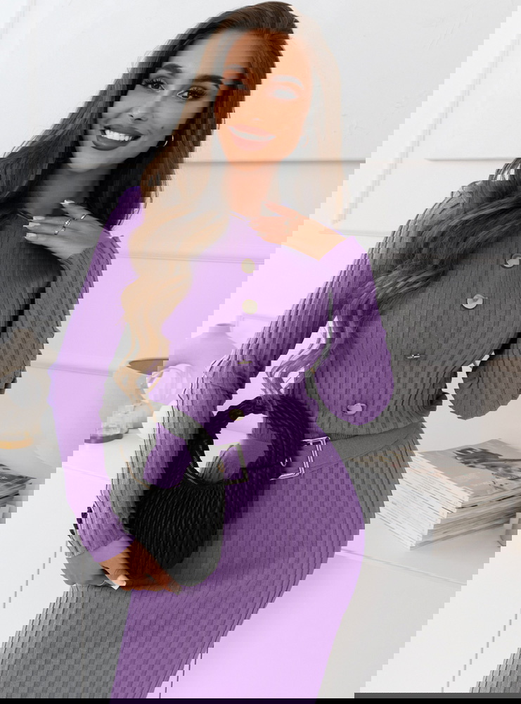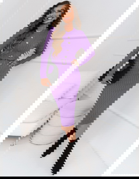 Liliowa sweterkowa prążkowana sukienka z ozdobnymi guzikami i paskiem Yolanda