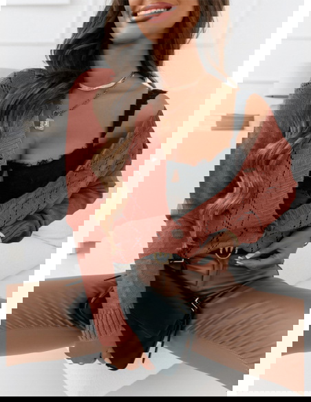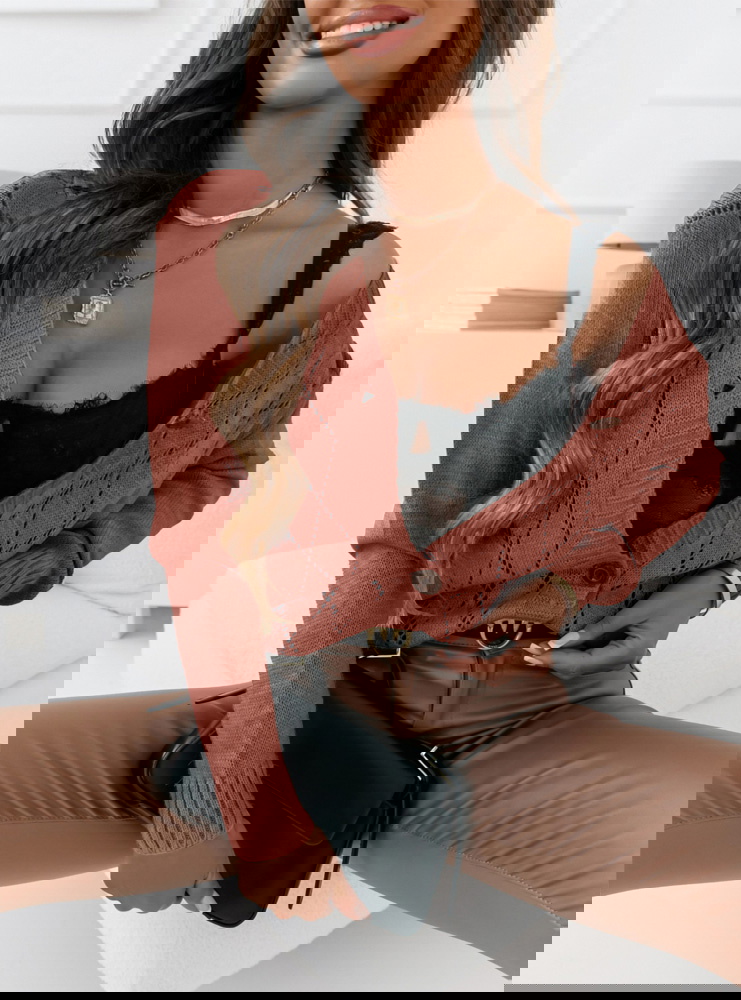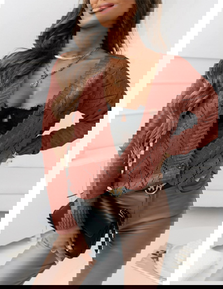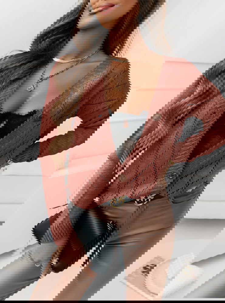 Ceglasty ażurkowy sweter zapinany na guziki z dekoltem w serek Betsy