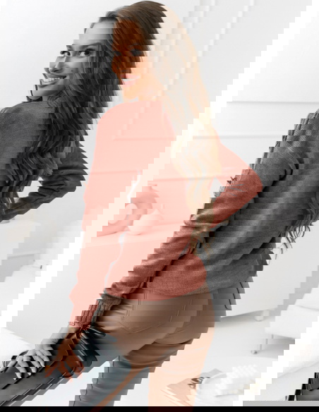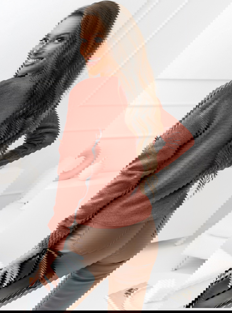 Ten ceglasty sweter to odważny wybór dla pewnych siebie kobiet. Jego wyjątkowy kolor, w połączeniu z rombowym wzorem, tworzy stylowy i nowoczesny wygląd. Kontrastujące guziki dodają mu charakteru, a miękki materiał zapewnia maksymalną wygodę noszenia.
