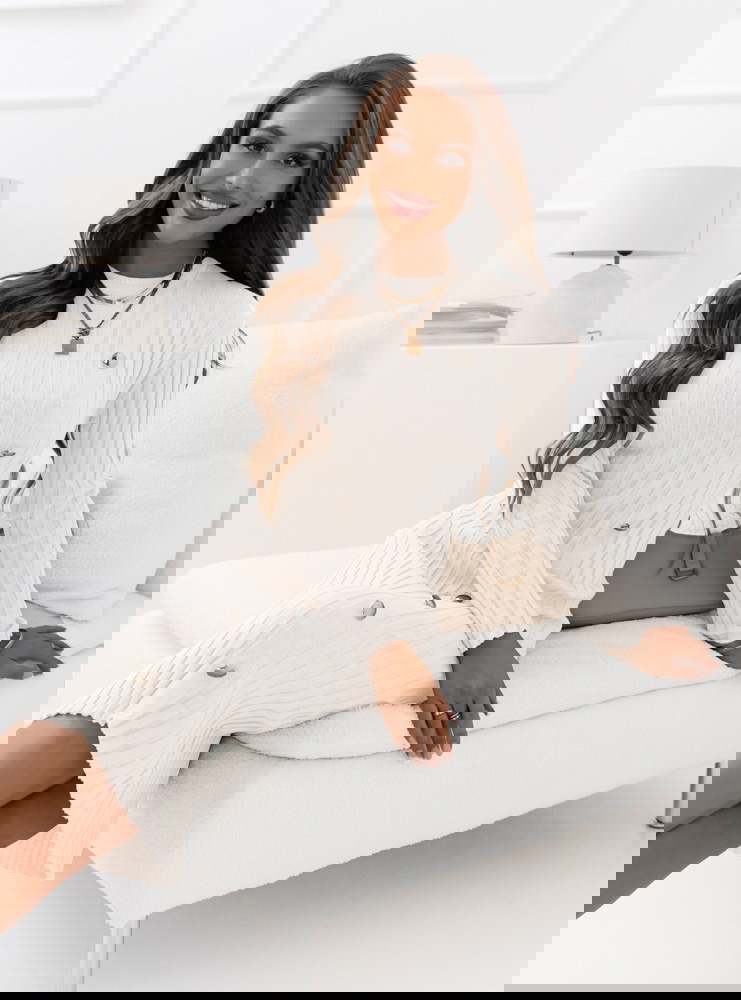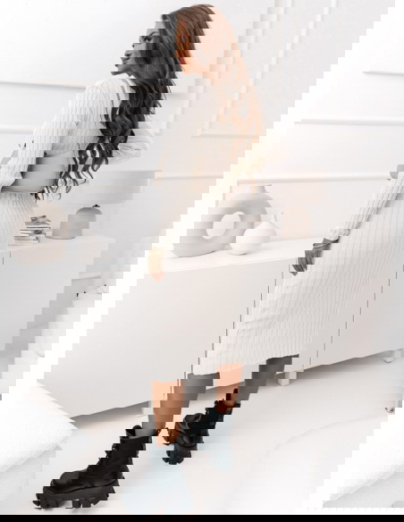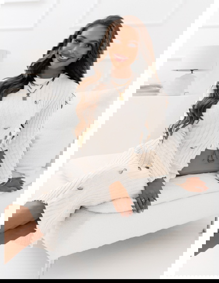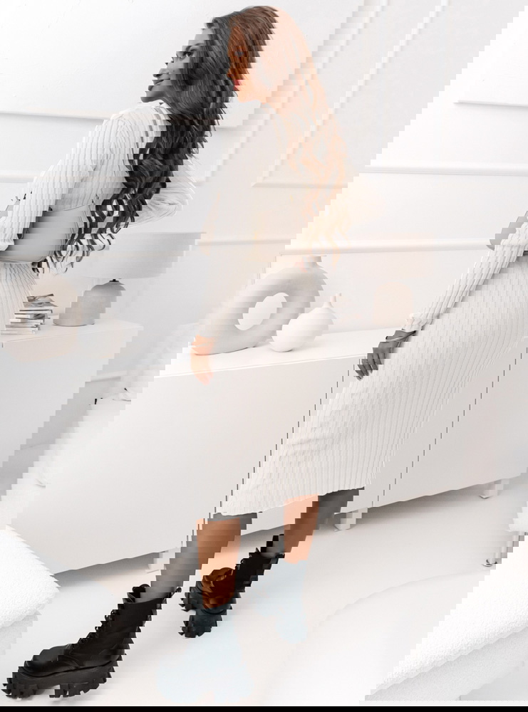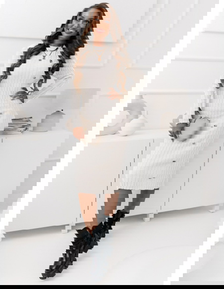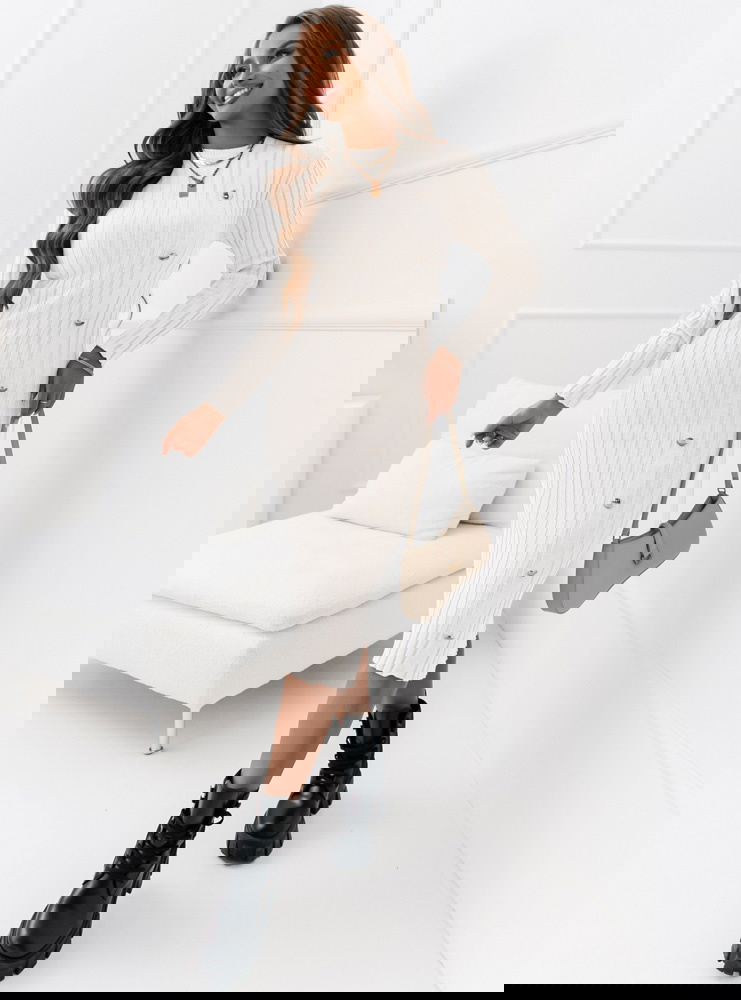 Sweterkowa prążkowana sukienka z ozdobnymi guzikami Daniella - ecru Wybierając tę sukienkę w odcieniu ecru, inwestujesz w ponadczasową elegancję, która nigdy nie wychodzi z mody.