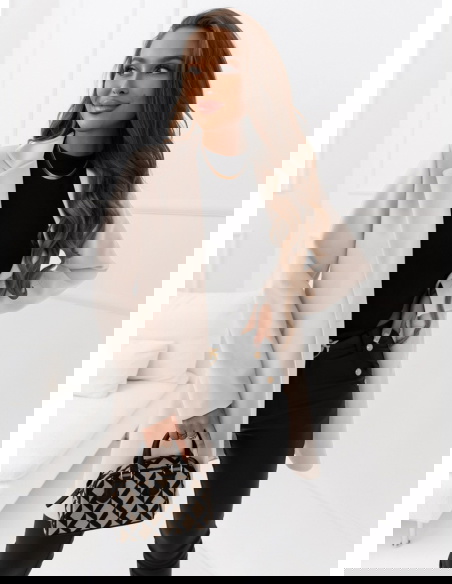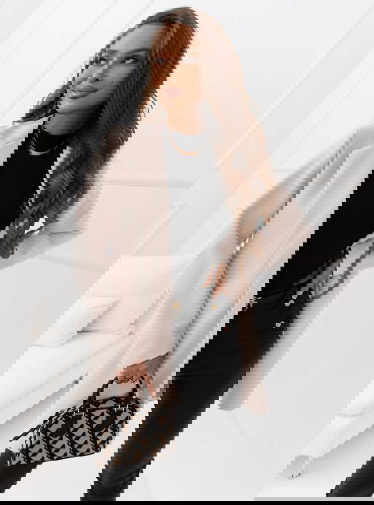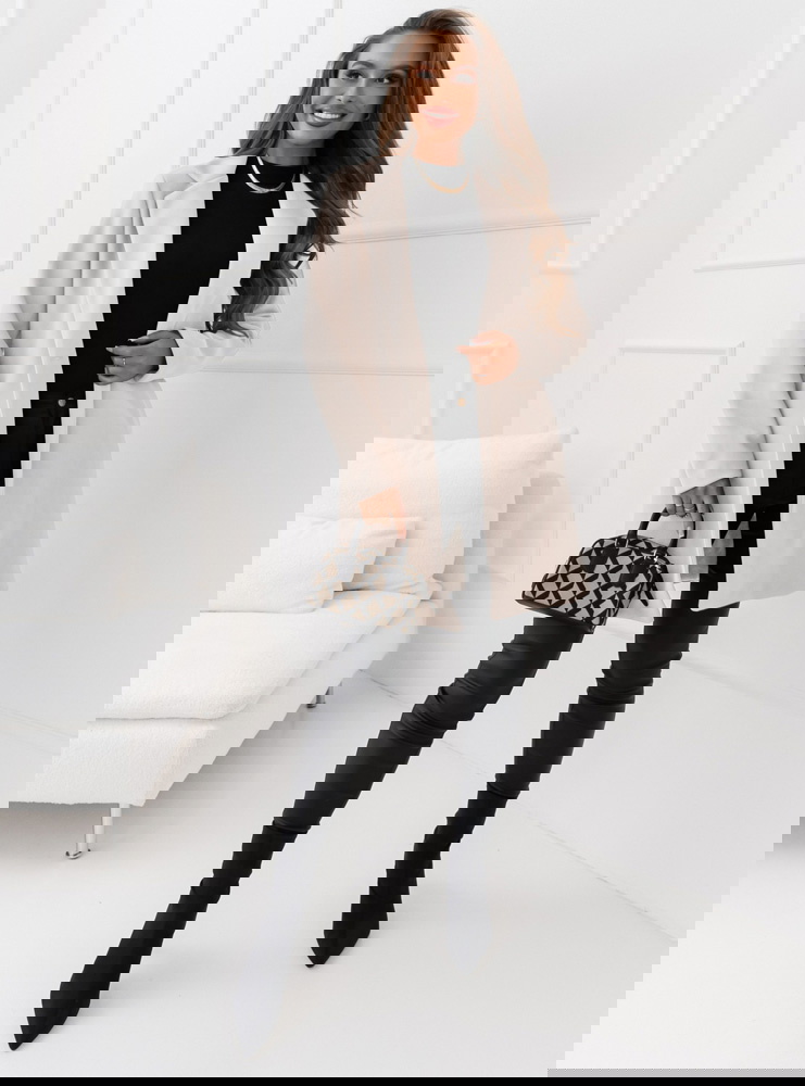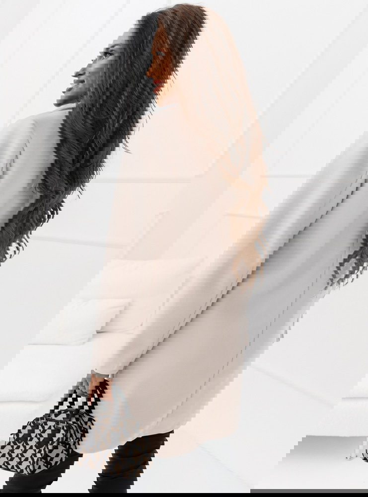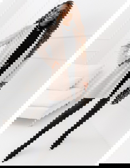 Ten płaszcz w delikatnym odcieniu beżu emanuje elegancją i klasyką. Jego prosta linia i wykończenie mówią o dbałości o detale. Szersze, prostokątne kołnierze dodają mu nowoczesnego charakteru. Jednolity kolor płaszcza pozwala na łatwe łączenie go z różnymi stylizacjami. Idealny na chłodniejsze dni, doskonale chroni przed wiatrem. Jego długość jest uniwersalna i pasuje do wielu sylwetek. Płaszcz ten jest symbolem prostoty, ale z wyraźnym akcentem luksusu. Jego kieszenie umożliwiają przechowywanie drobnych przedmiotów, jednocześnie nie burząc linii płaszcza. Będzie doskonałym dodatkiem do garderoby na jesień i zimę.