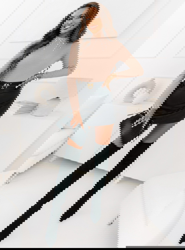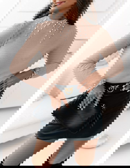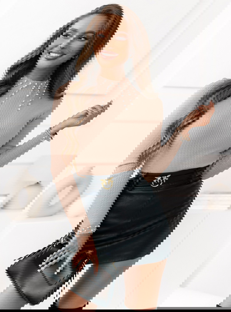 Beżowy dopasowany sweterek z ozdobnymi perełkami Audrey