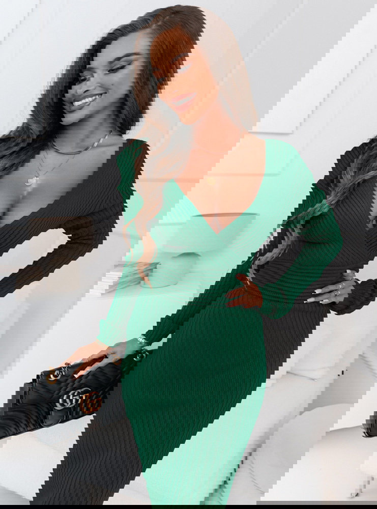 Prążkowana sweterkowa sukienka z przekładanym dekoltem Winona - butelkowa zieleń