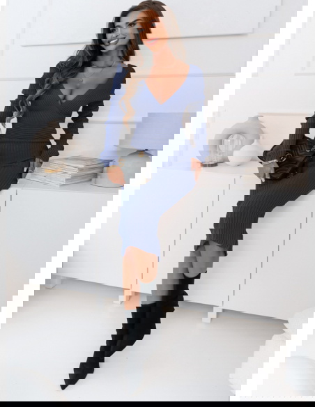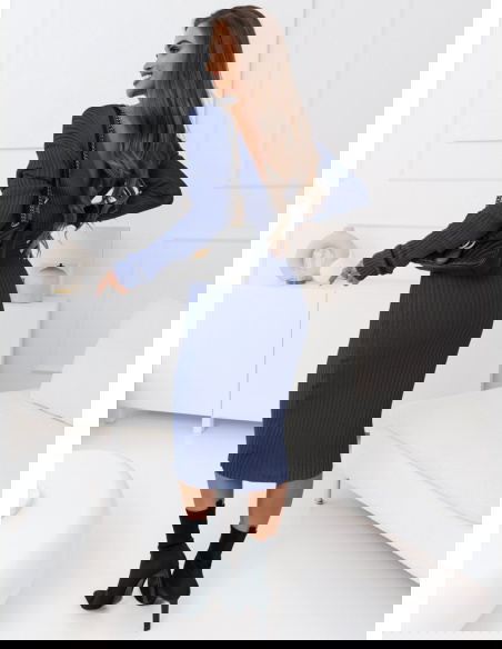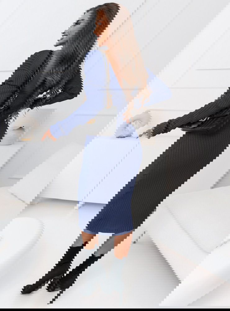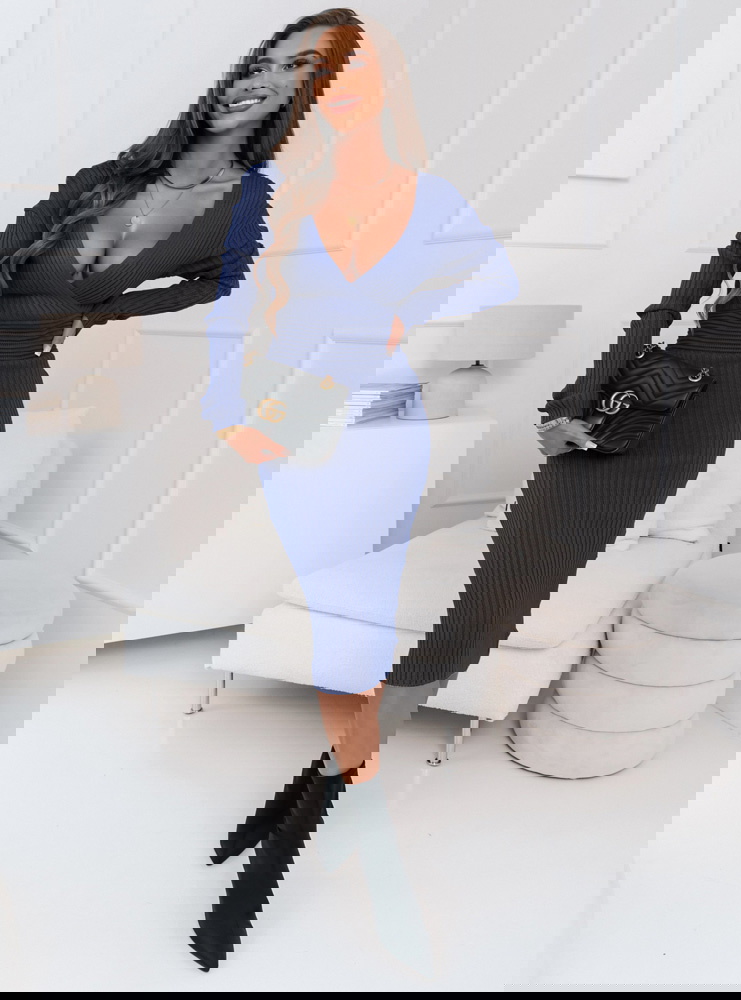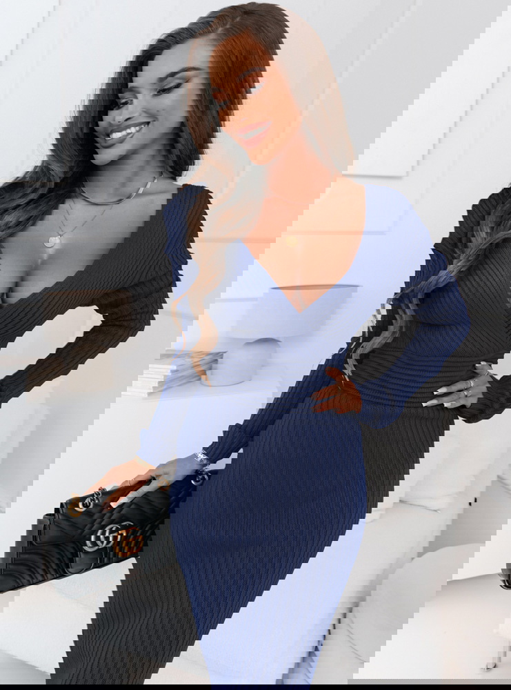 Granatowa prążkowana sweterkowa sukienka z przekładanym dekoltem Winona To ubranie, które pozwoli Ci wyglądać szykownie i czuć się wygodnie jednocześnie.