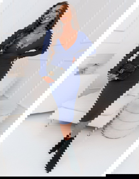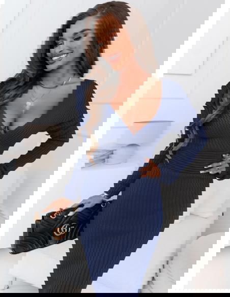 Granatowa prążkowana sweterkowa sukienka z przekładanym dekoltem Winona