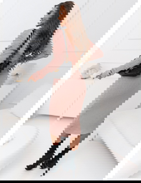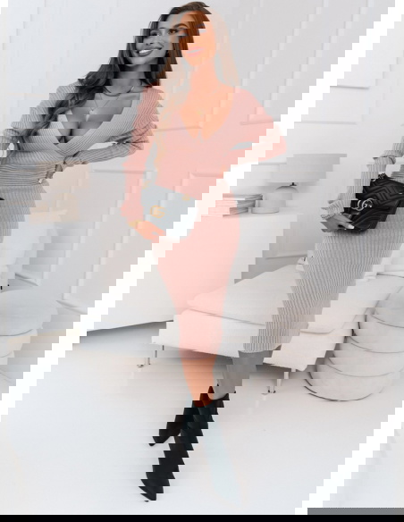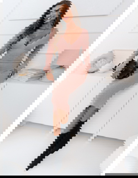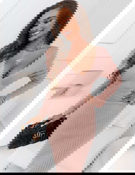 Pudrowa prążkowana sweterkowa sukienka z przekładanym dekoltem Winona
