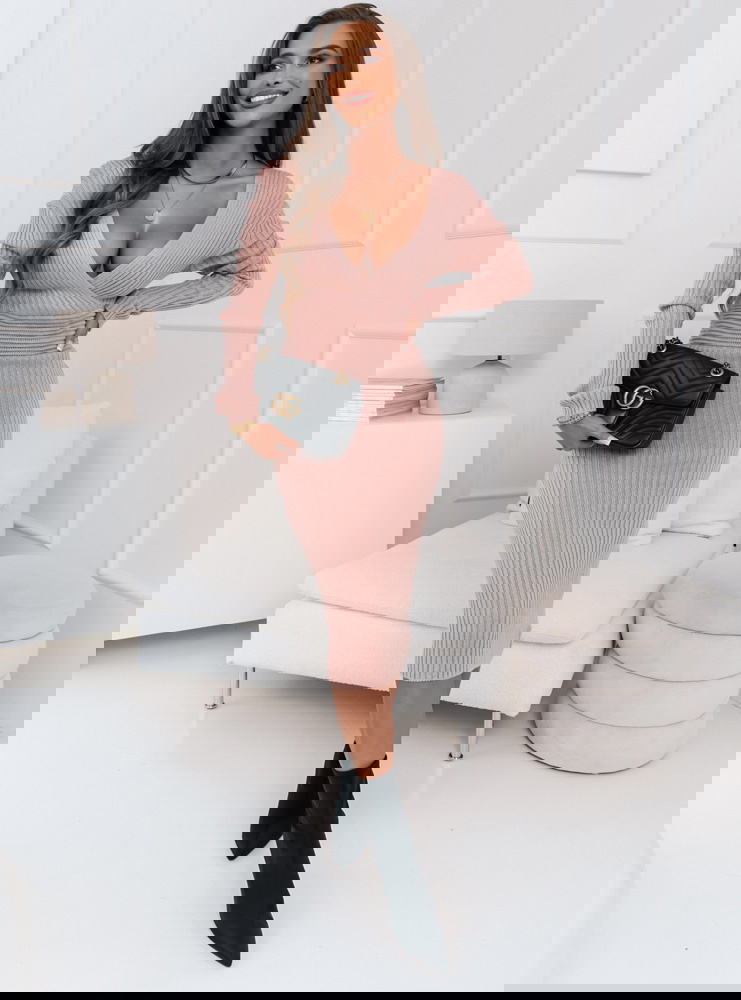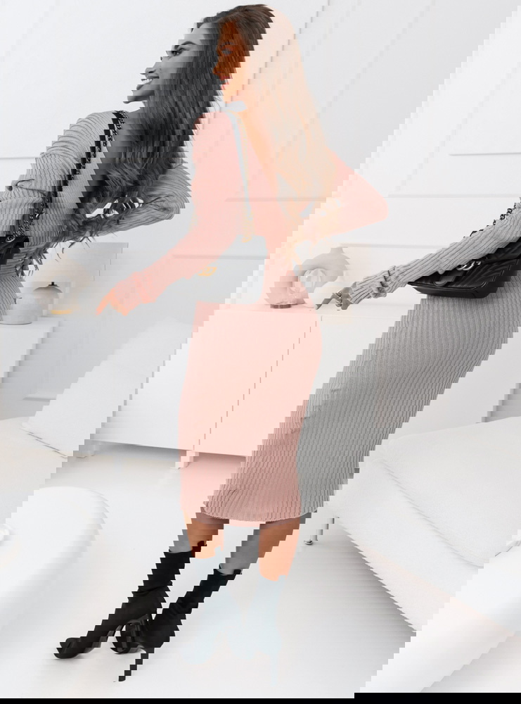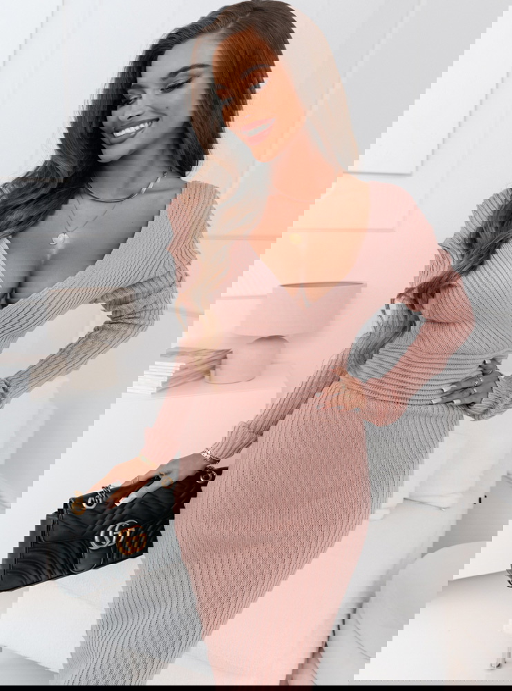 Pudrowa prążkowana sweterkowa sukienka z przekładanym dekoltem Winona Jest idealnym wyborem na wieczorne wyjścia, przyjęcia czy bardziej formalne okazje.