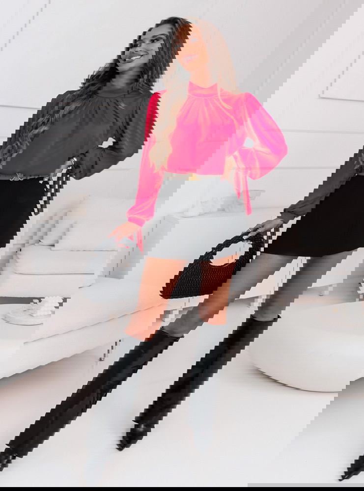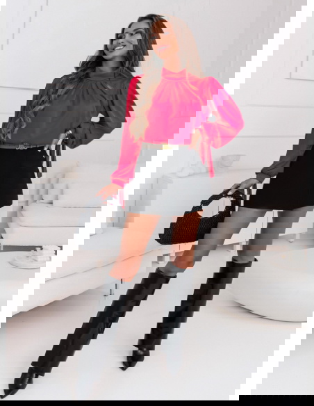 Bluzka w kolorze malinowym wykonana z satyny prezentuje się niezwykle wytwornie i dynamicznie. Posiada charakterystyczne, wiązane rękawy, które dodają jej niepowtarzalnego charakteru. Takie rozwiązanie jest nie tylko modnym akcentem, ale również pozwala na indywidualne dopasowanie długości rękawów, co jest bardzo praktyczne. Stójka, czyli wysoki kołnierz, podkreśla szyję i dodaje bluzce elegancji. Delikatne marszczenia na przodzie bluzki są kolejnym elementem, który wzbogaca jej design. Malinowy kolor bluzki ładnie kontrastuje z ciemniejszymi elementami garderoby, a satynowy materiał dodaje całości luksusowego wyglądu.