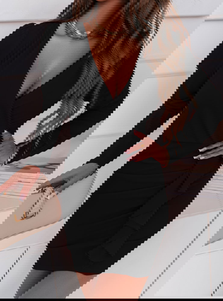 Ta czarna sukienka emanuje klasą i subtelną elegancją. Uniwersalny kolor sprawia, że jest to kreacja na wiele okazji. Asymetryczne falbanki dodają jej niepowtarzalnego charakteru i nowoczesności. Głęboki dekolt typu V podkreśla dekolt, nadając sylwetce zmysłowego akcentu. Dopasowany krój doskonale podkreśli atuty kobiecej sylwetki. Długość mini skupia uwagę na nogach, co jest idealnym rozwiązaniem na letnie wieczory. Długie rękawy sprawiają, że sukienka jest również odpowiednia na chłodniejsze dni. Prosty design w połączeniu z falbankami tworzy wyjątkową harmonię.
