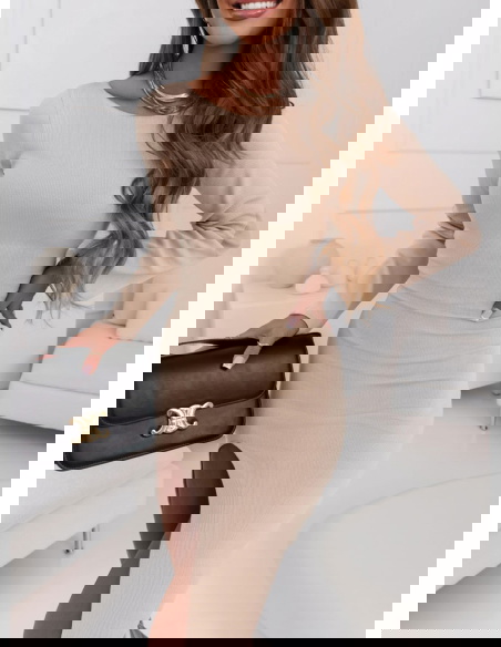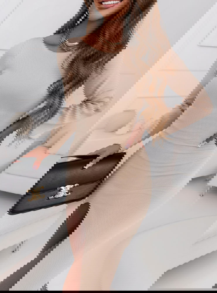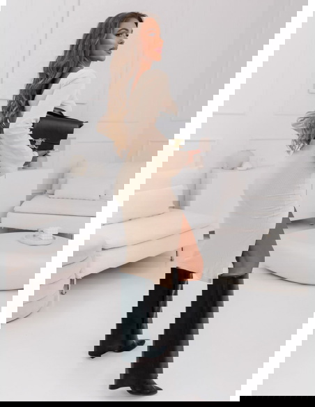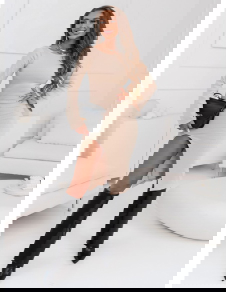 Beżowa prążkowana sukienka z rozcięciem Doona