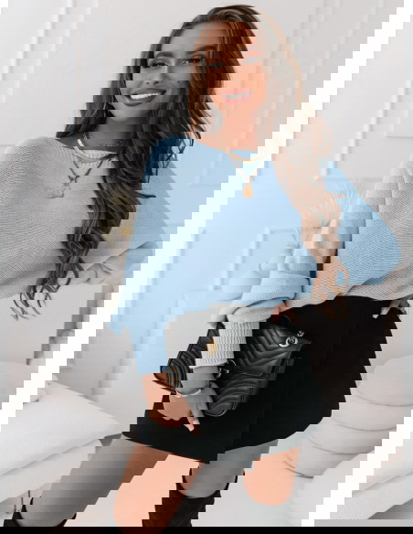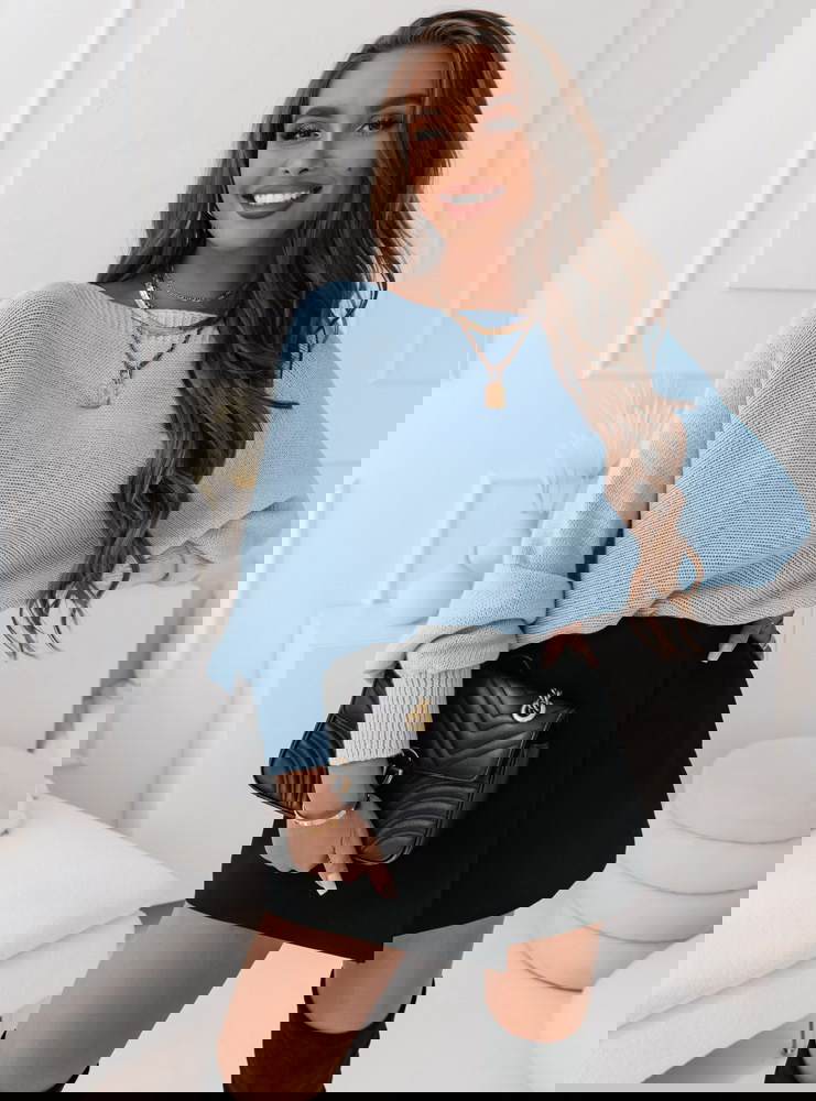 Błękitny oversizowy sweter z wiązaniem na plecach Moneka Dzięki swemu uniwersalnemu kolorowi i niebanalnemu designowi, błękitny sweter stanie się nieodzownym elementem garderoby każdej kobiety, która chce wyglądać stylowo, a jednocześnie czuć się komfortowo i pewnie.