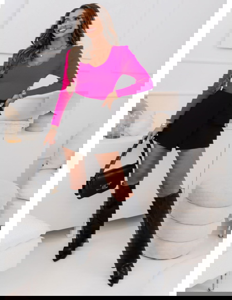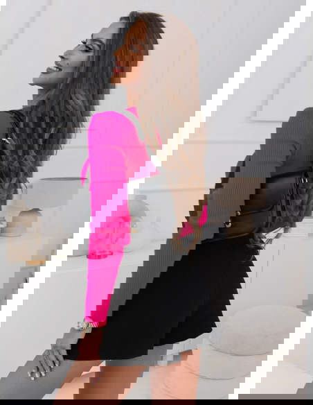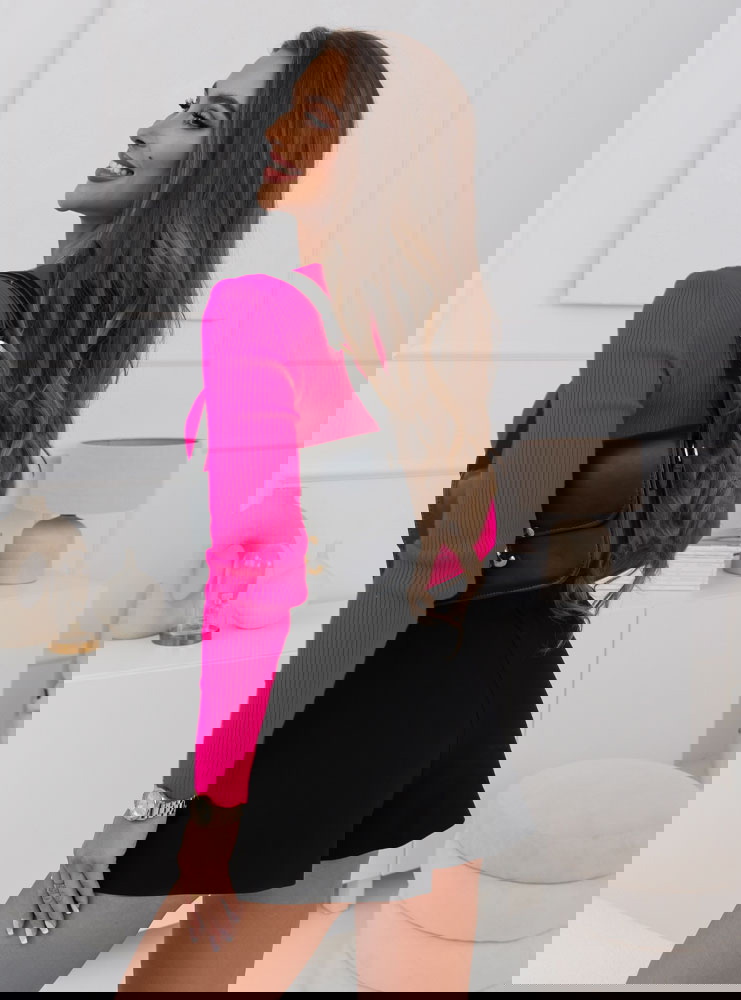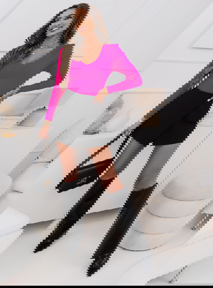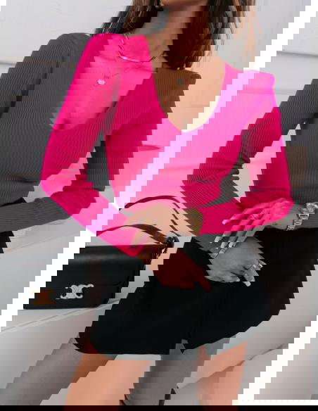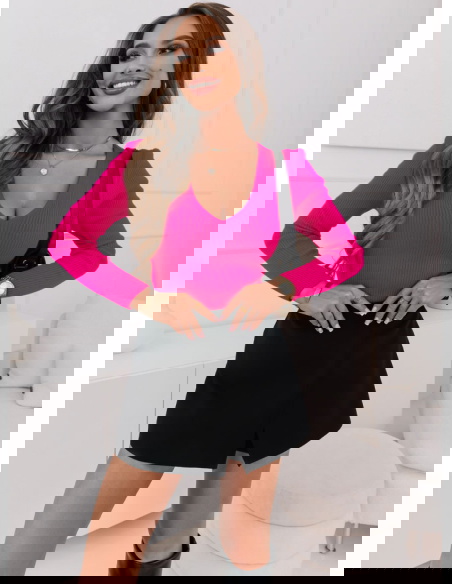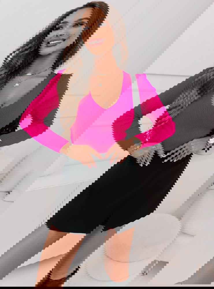 Prążkowany sweter z dekoltem w serek Nozkka - neonowy róż Bluzka w neonowym różu jest idealna dla odważnych kobiet, które chcą się wyróżnić z tłumu i wyrazić swoją unikalność.