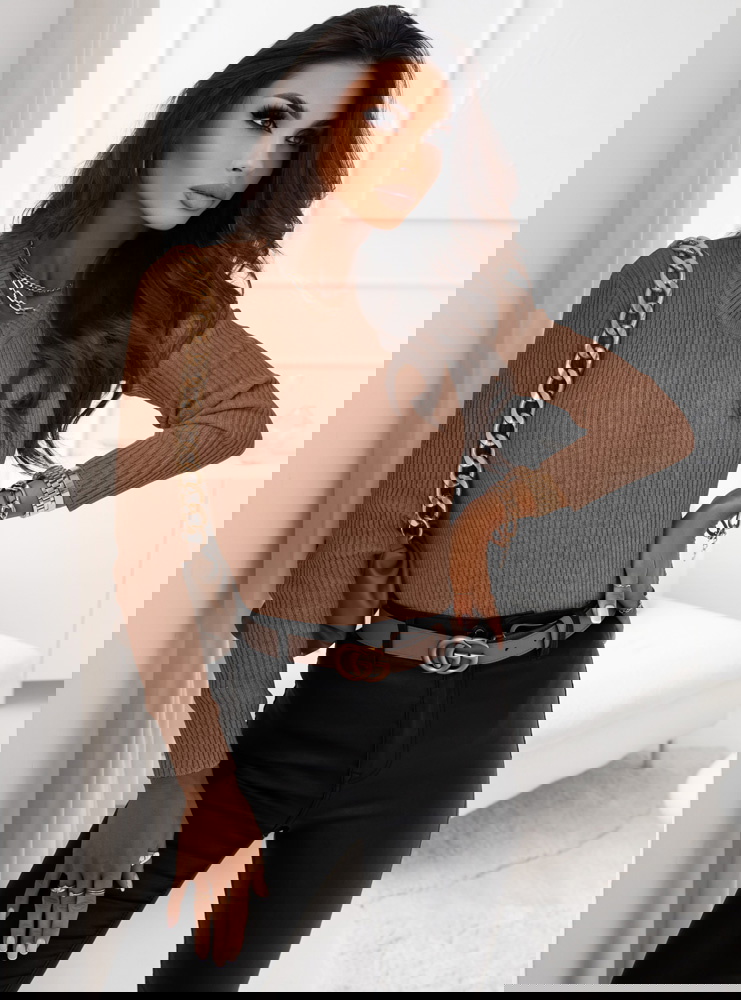 Sweterek z dekoltem w serek Romika - odcienie brązu To absolutny must-have dla każdej kobiety ceniącej sobie uniwersalność i elegancję w jednym.