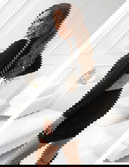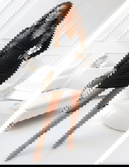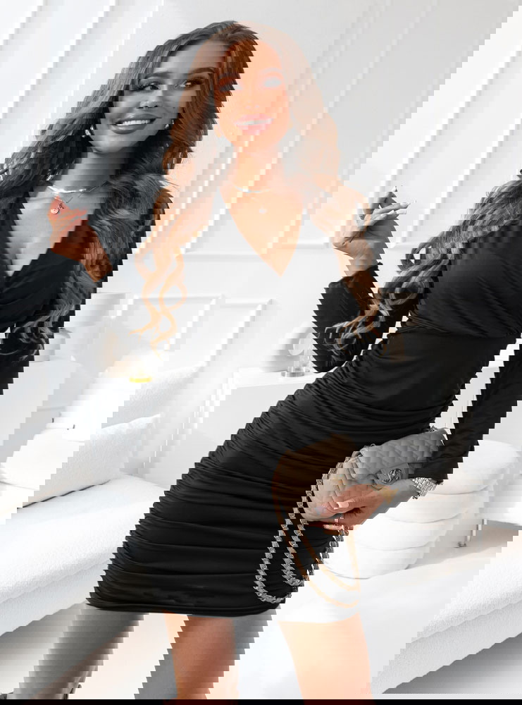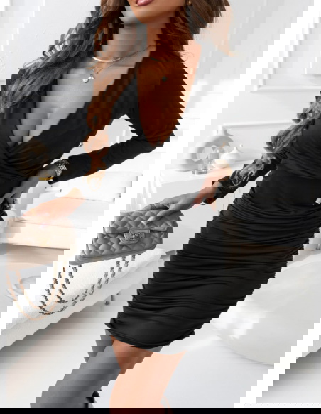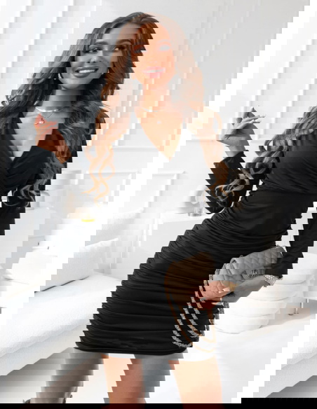 Czarna marszczona sukienka z dekoltem Bahia Jej elegancja i zmysłowość przyciągają uwagę, sprawiając, że poczujesz się wyjątkowo.